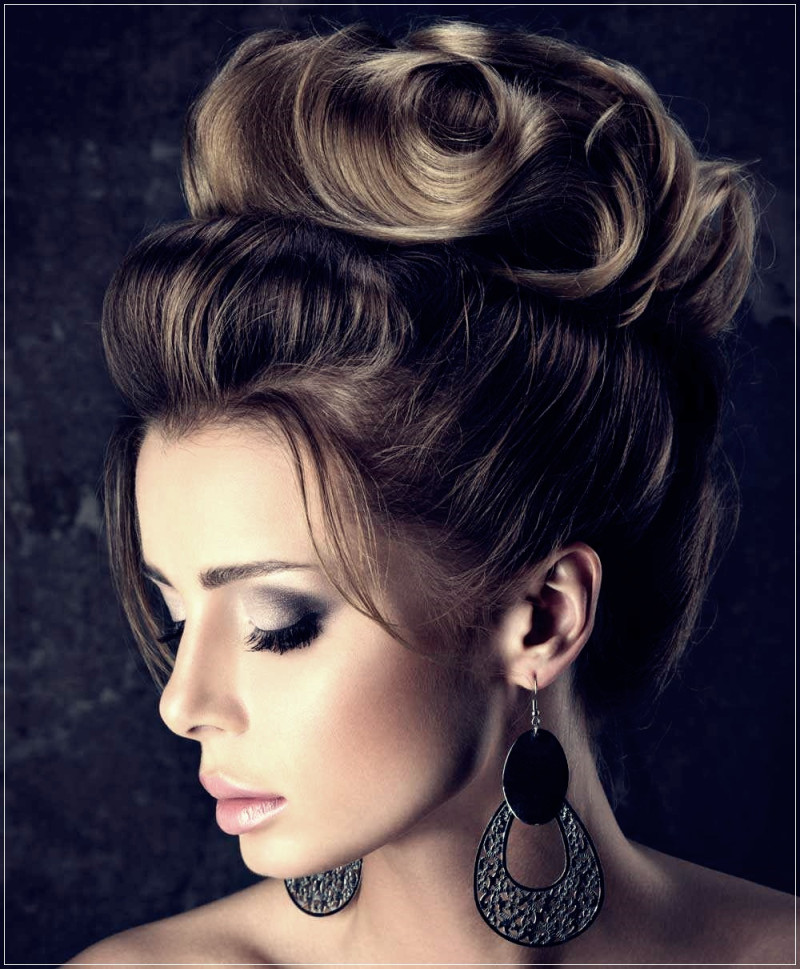 - Поднимаем хвостик вверх и укладываем в свободном порядке, помогая шпильками и сильным лаком для волос.