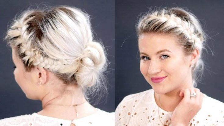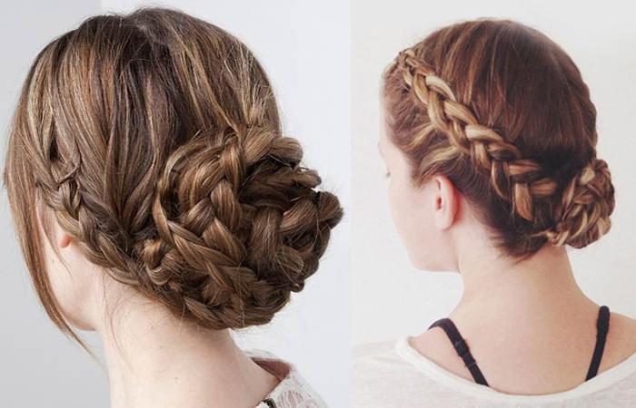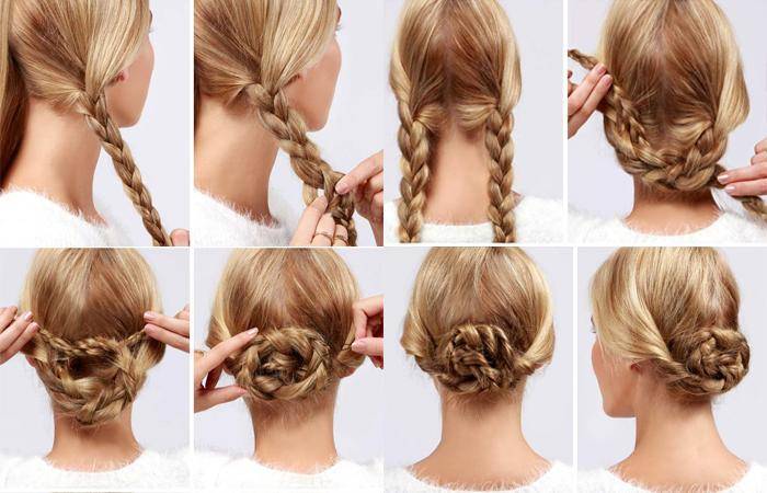 Разделите волосы на две части и сделайте на каждой из них обычную трехпрядную косичку. Затем перекрестите их на затылке и сделайте из них бантик, закрепив заколками. Эта прическа выглядит очень красиво и стильно.