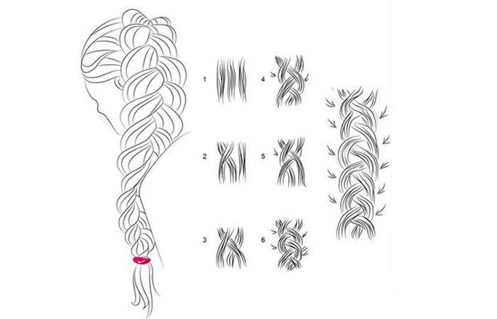 - Формировать трехлучевую косу, заплетая весь объем волос начиная от теменной области, двигаясь к противоположному уху.
