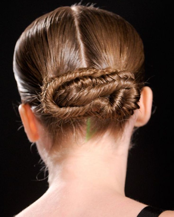 Соберите волосы в высокий конский хвост и сделайте из него обычную трехпрядную косу. Затем закрепите ее заколками на макушке головы. Этот стиль придает объем и текстуру волосам и выглядит очень элегантно.