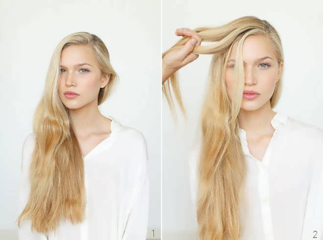 1. Расчесываем шевелюру на боковой пробор и перебрасываем все волосы на одну сторону.
