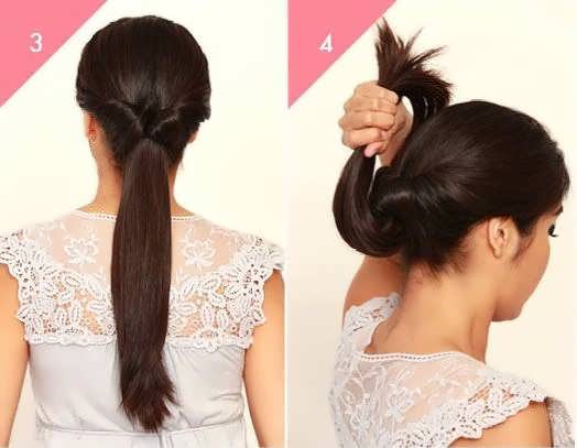 Это предельно просто: волосы собираются сзади в пучок. Предварительно следует нанести на волосы стайлинг-средство, собрать волосы в низкий или высокий хвост. Можно сделать боковой пробор или не делать его вовсе. Процесс создания подобной деловой прически отнимет 15 минут максимум.