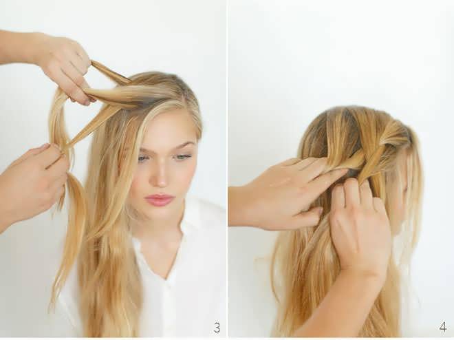 - Коса начинается плестись от правого или левого виска. Выделяется две пряди, которые перекрещиваются между собой.