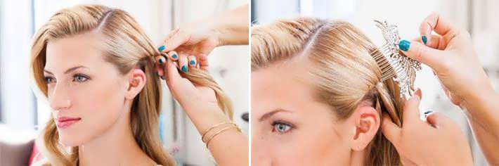 Шаг 7. С той стороны, где волос меньше, отбираем тонкую прядь и скручиваем ее в жгут. Прикрепляем его к остальным волосам с помощью невидимки. Начало жгута украшаем красивым гребнем.