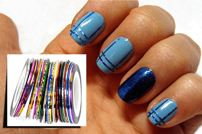 - Дождемся полного высыхания и приклеиваем полоски, отступив от края ноготка желаемую ширину;