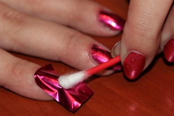 1 шаг. При помощи ватного диска и специальной жидкости избавьтесь от остатков прошлого дизайна. Давайте предпочтение тем средствам, которые не содержат ацетон. Чаще всего в них содержится целый комплекс полезных веществ, которые не вредят, а питают.