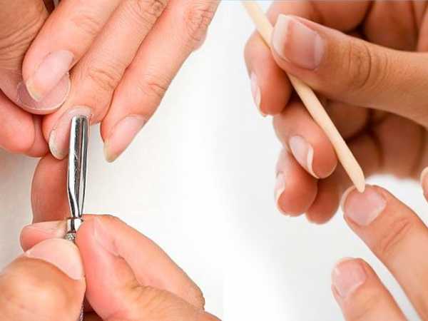 - По очереди вынимаем из воды каждый пальчик, начиная с мизинца, и пушером или деревянной палочкой приподнимаем и отодвигаем кутикулу. Убираем загрязнения и щипчиками аккуратно срезаем белую кожу с ногтевых валиков и у ногтевого основания;