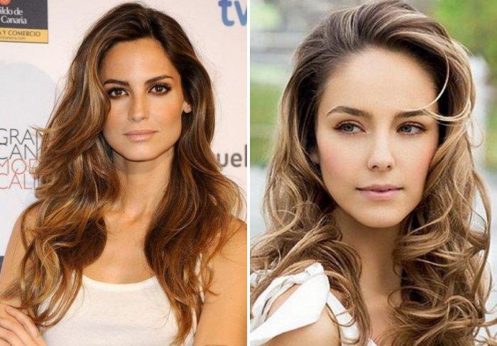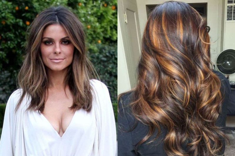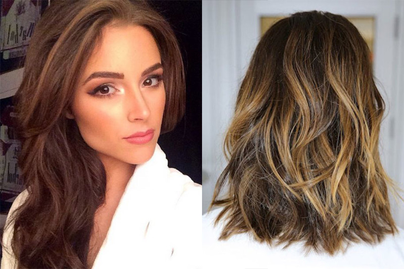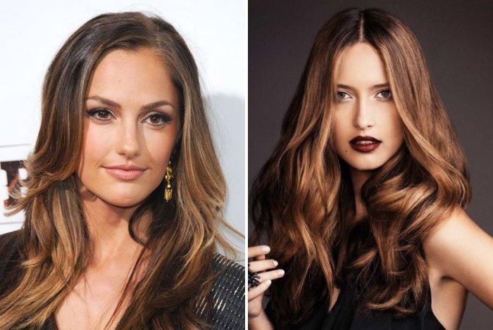 - Если вы обладательница насыщенного темного оттенка волос, естественный вид «выгоревших» волос будем придавать с помощью 4-х теплых оттенков краски. Вам понадобятся тоны: каштановый, медный, молочный шоколад, коньячный.