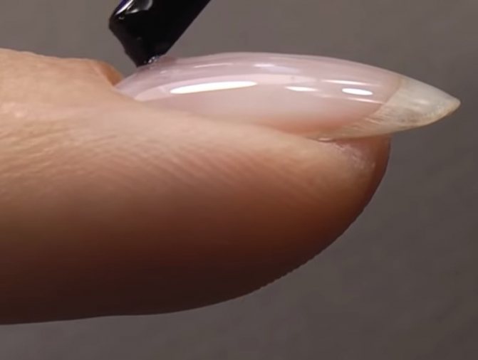 - Палец наклоняют чуть вниз, кладут кисть с материалом на серединную линию и толкают инструмент к кутикуле.