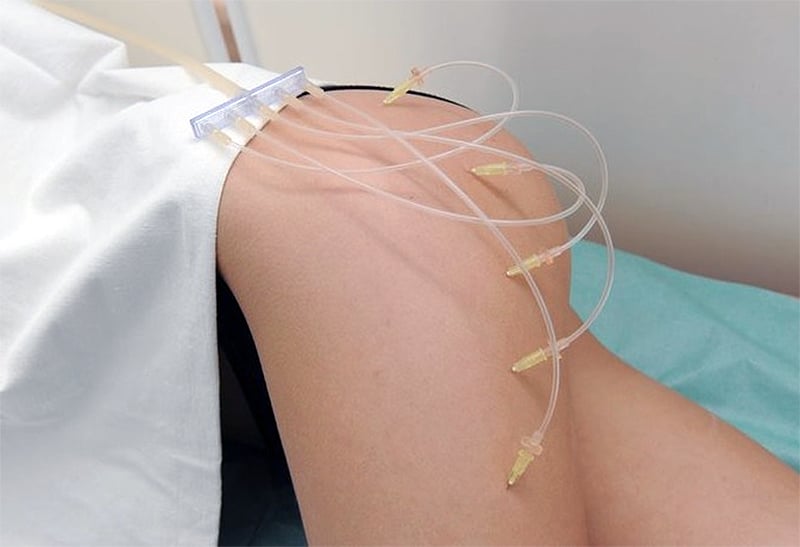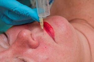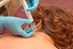Затем производятся инъекции тонкой иглой. На больших участках используется специальный мультиинжектор для того, чтобы свести к минимуму количество проколов кожи.