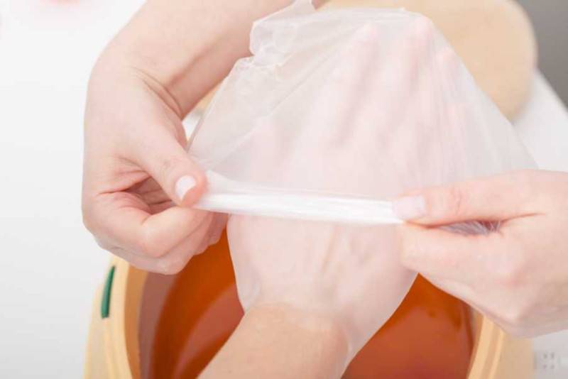 Для рук считается самой популярной процедурой. Эффективно затягивает ранки и незначительные трещины. Кроме того, она способствует улучшению состояния ногтей, устранению шелушения и увлажняет эпидермис рук. Кисти рук погружают в предварительно разогретый парафин и держат их там в течение 10 с. Такое погружение следует выполнить 5-6 раз. После этого на руки надевают водонепроницаемые пакеты, а сверху – специальные термоперчатки, и держат до 20 мин. По истечении этого времени перчатки снимают и бережно массируют руки. Потом снимают и пакеты.