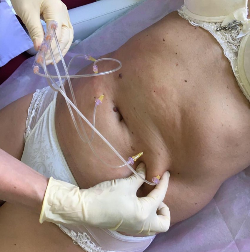 Затем производятся инъекции тонкой иглой. На больших участках используется специальный мультиинжектор для того, чтобы свести к минимуму количество проколов кожи.