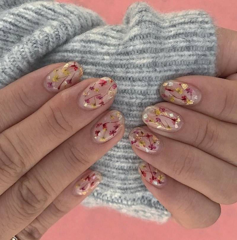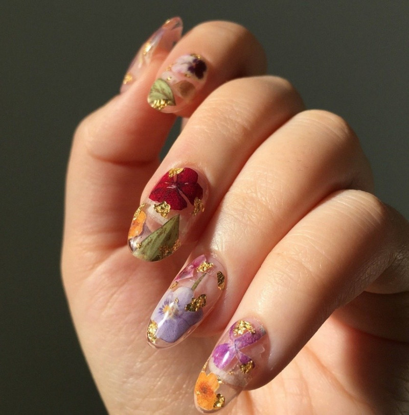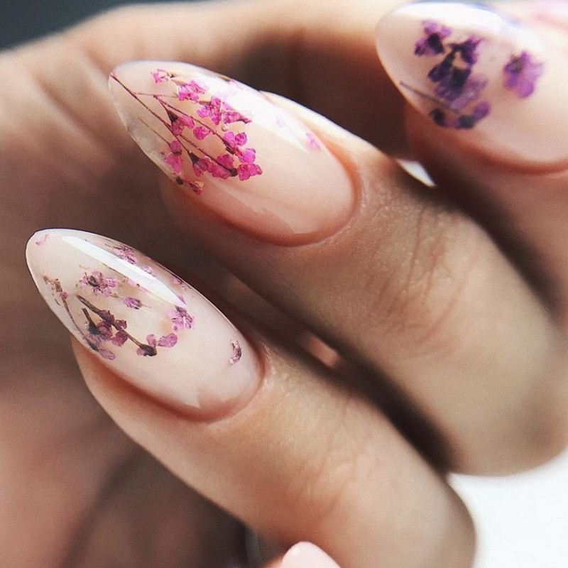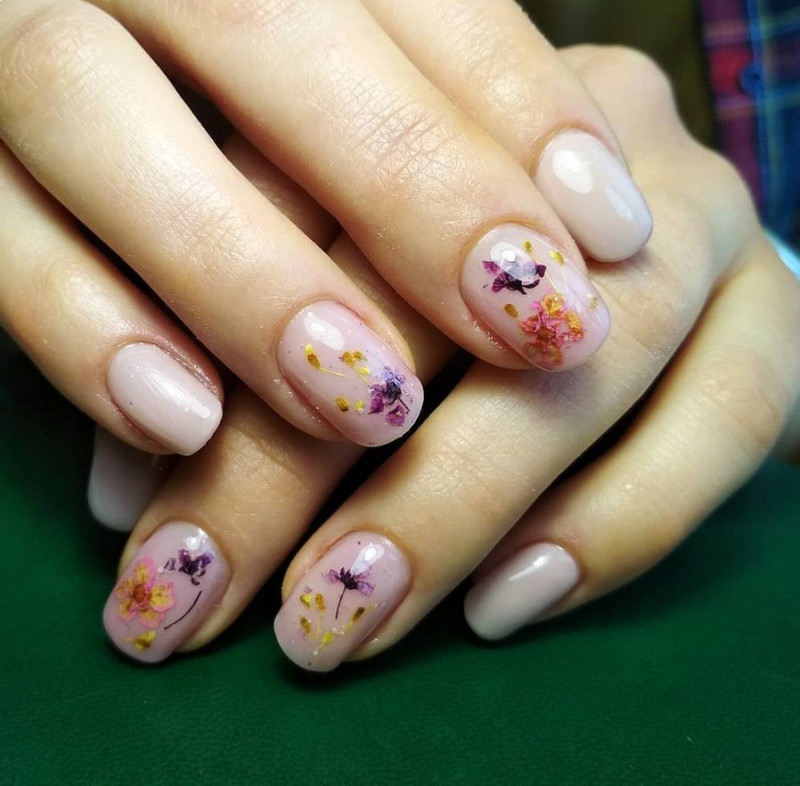 Засушенные фрагменты растений укладываются на покрытую непросохшим слоем базы ногтевую пластину, расправляются и покрываются сверху прозрачны гель-лаком.