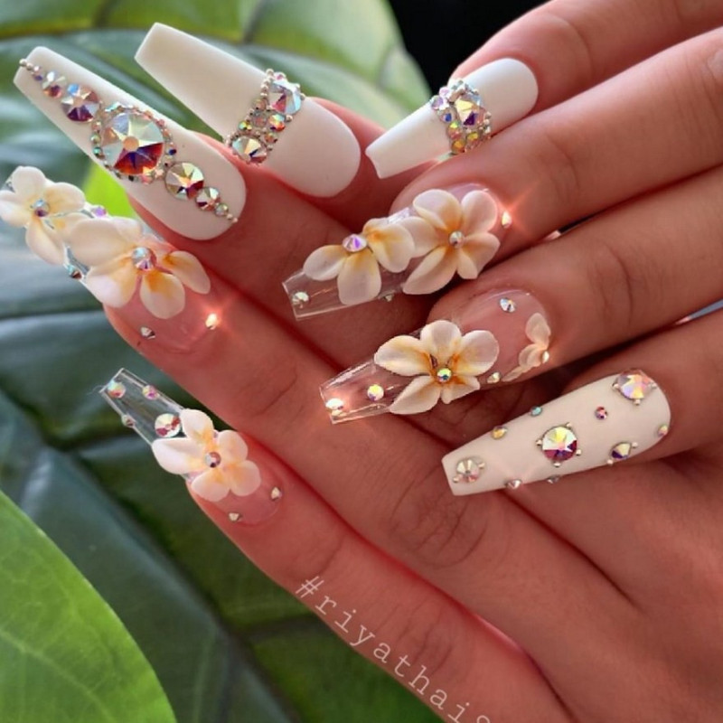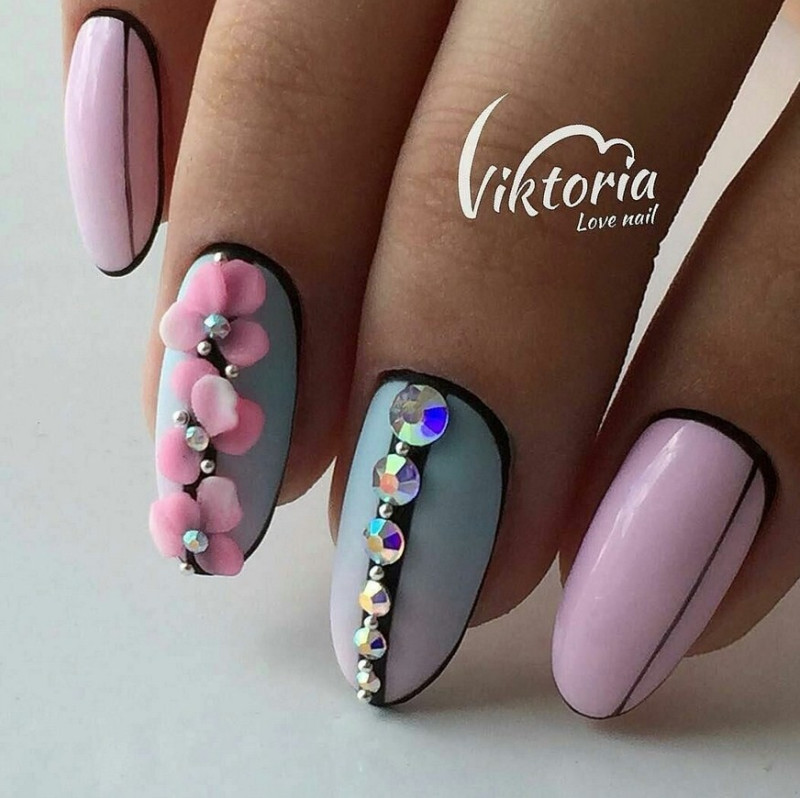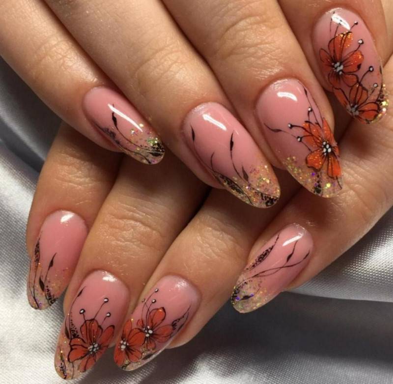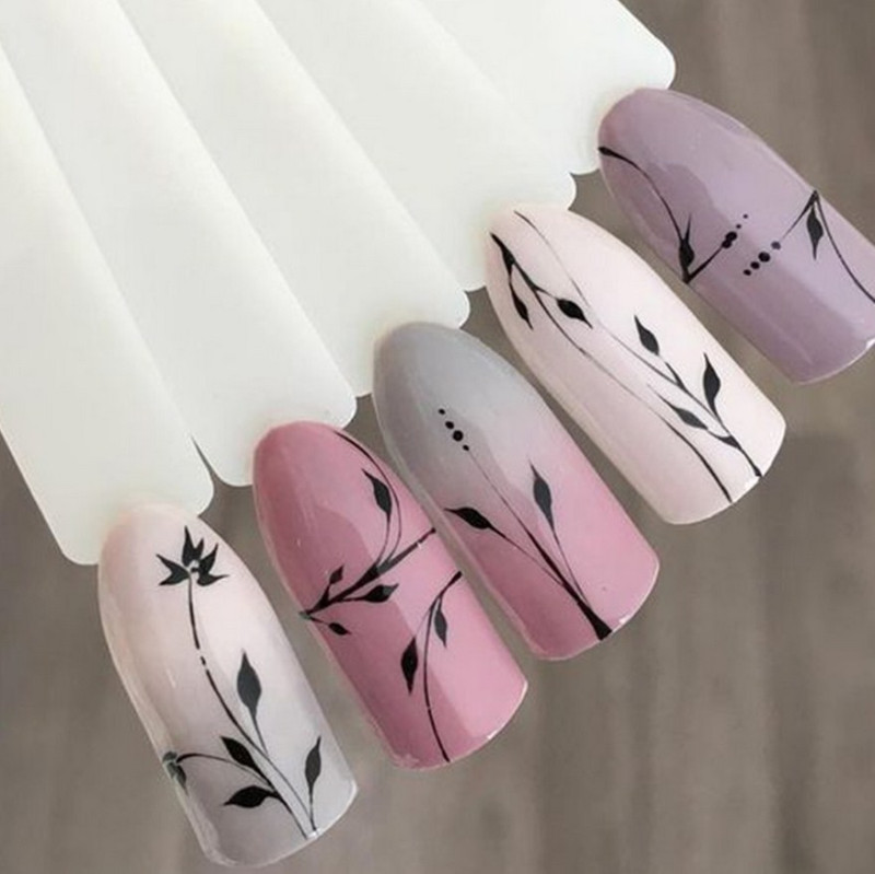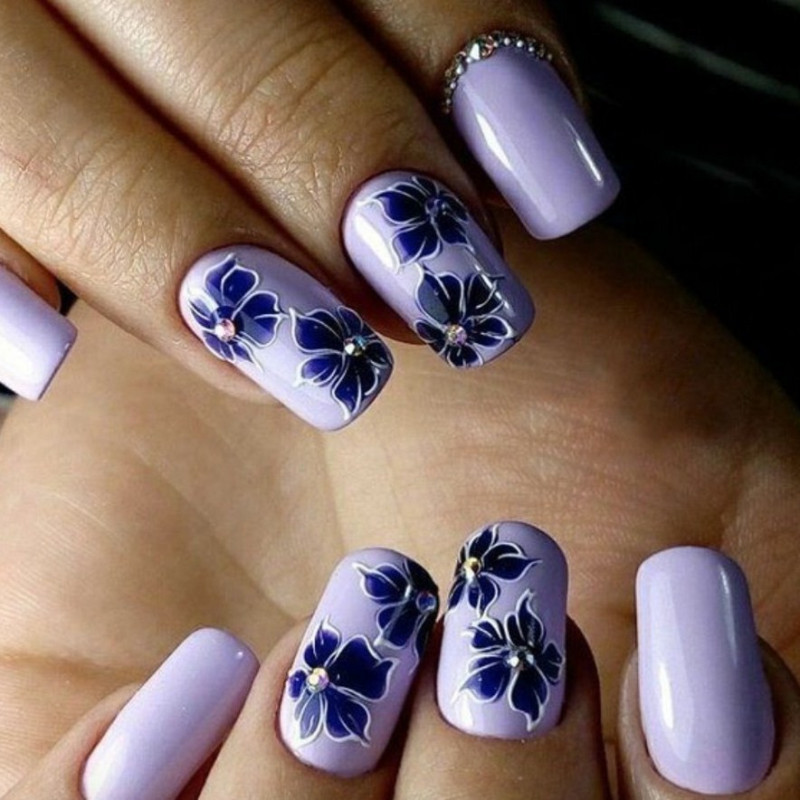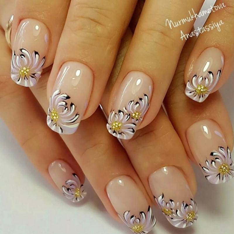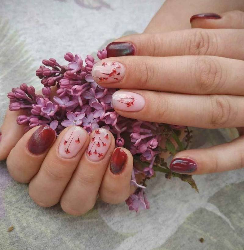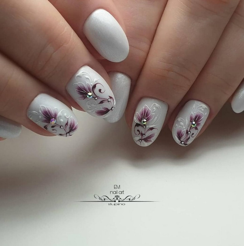 - «Цветочные мотивы». В тренде изображение стеблей тонкими кисточками с еще не распустившимися бутонами роз, веточек сакуры или коробочек хлопка. Рисунки могут наносится лаками, красками или лепниной. Дополнительный декор бусинами и цветными камешками придадут нейлу роскошный вид;