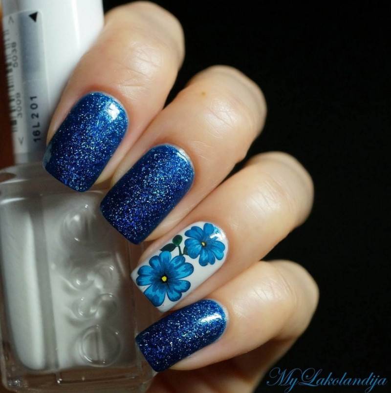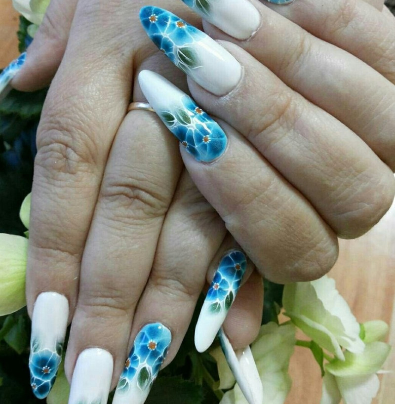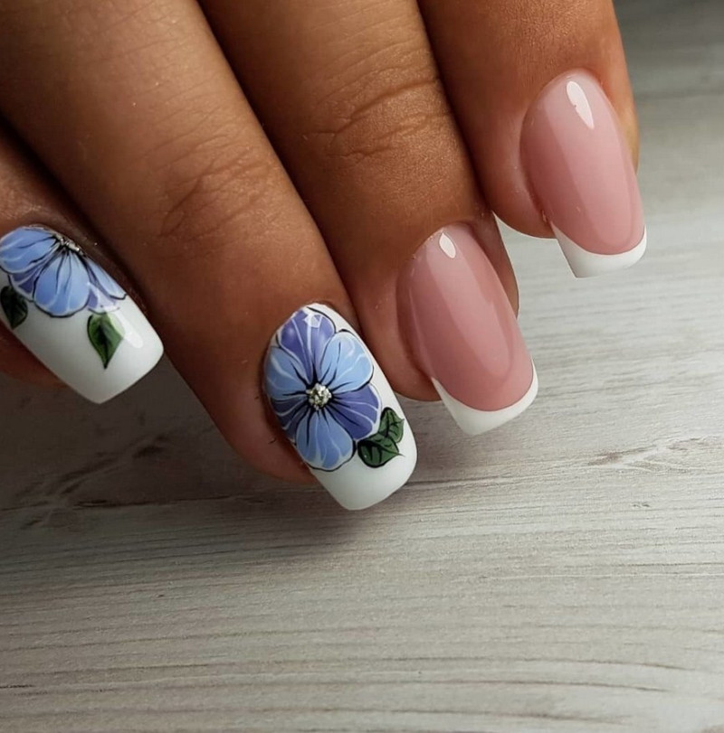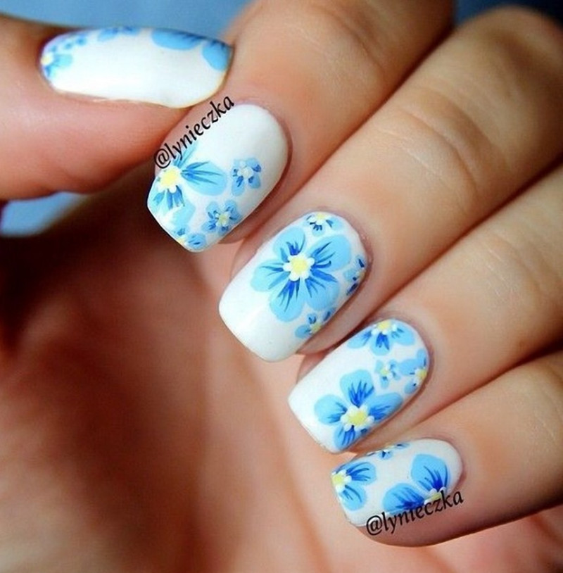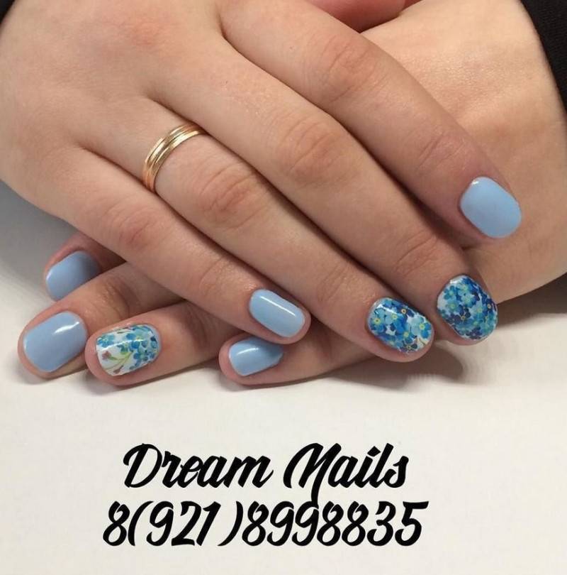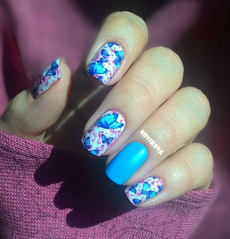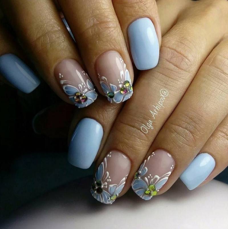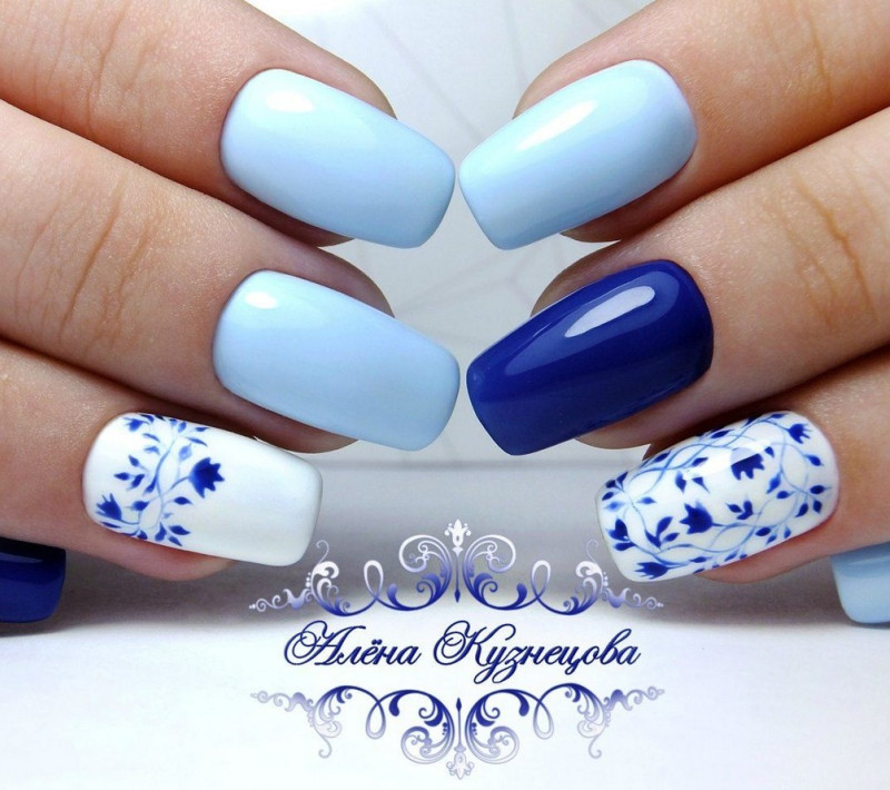 - «Весеннее небо». Голубой и бирюзовый с лазурным подтоном. Сочетание с белым нисколько не укоротит ноготки и придаст им интересный вид. Среди самых популярных нейл-артов — изображение крупных цветов или имитация узора «под гжель» на одном или двух ногтях;