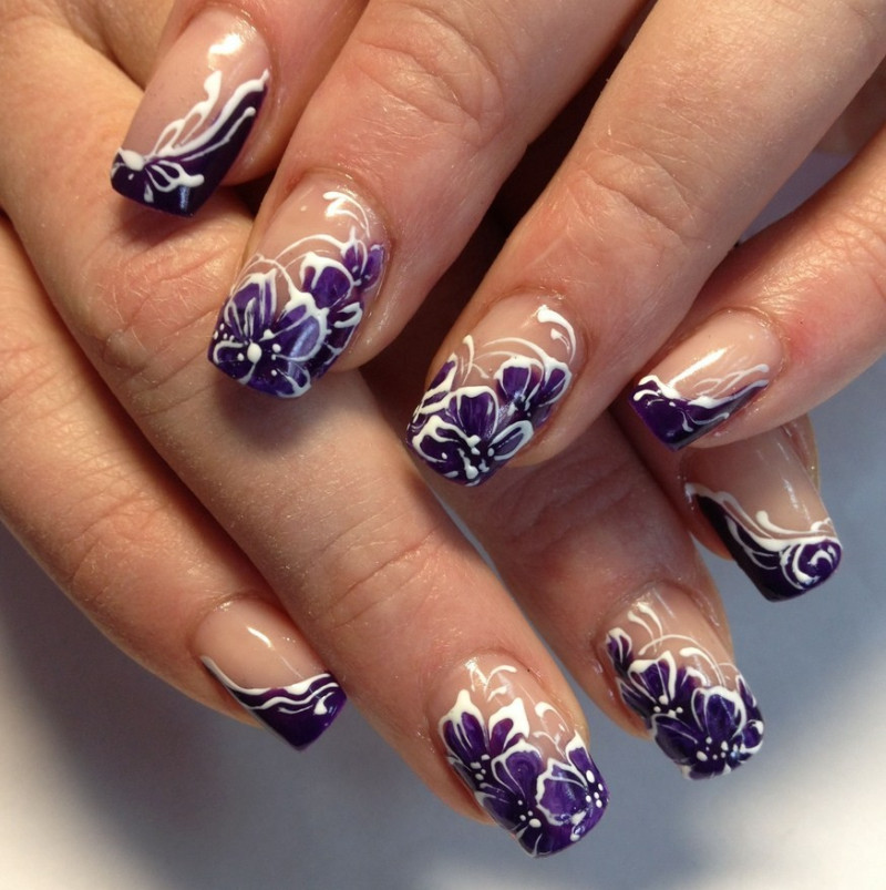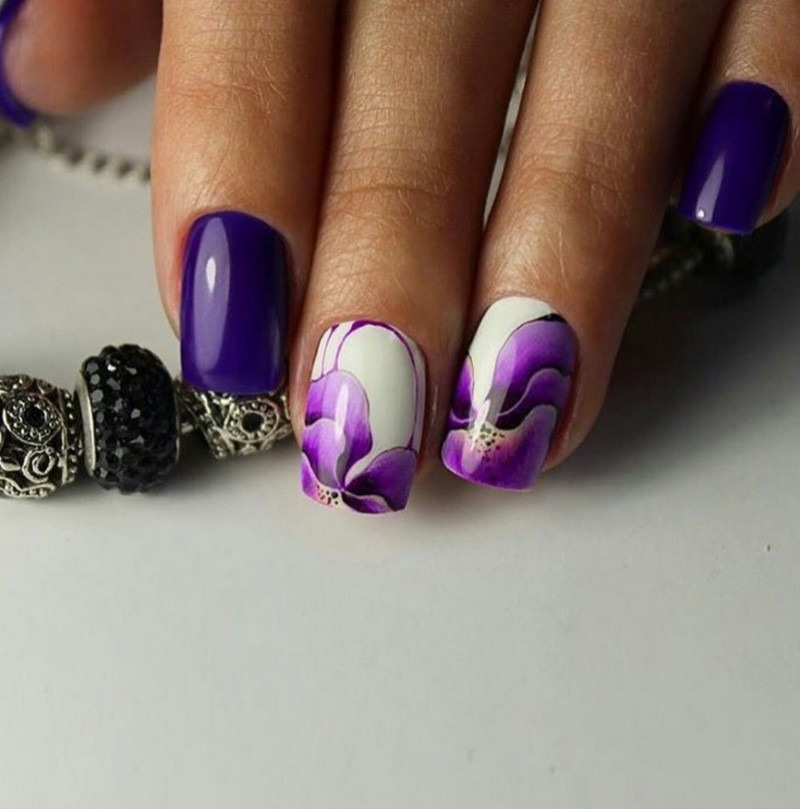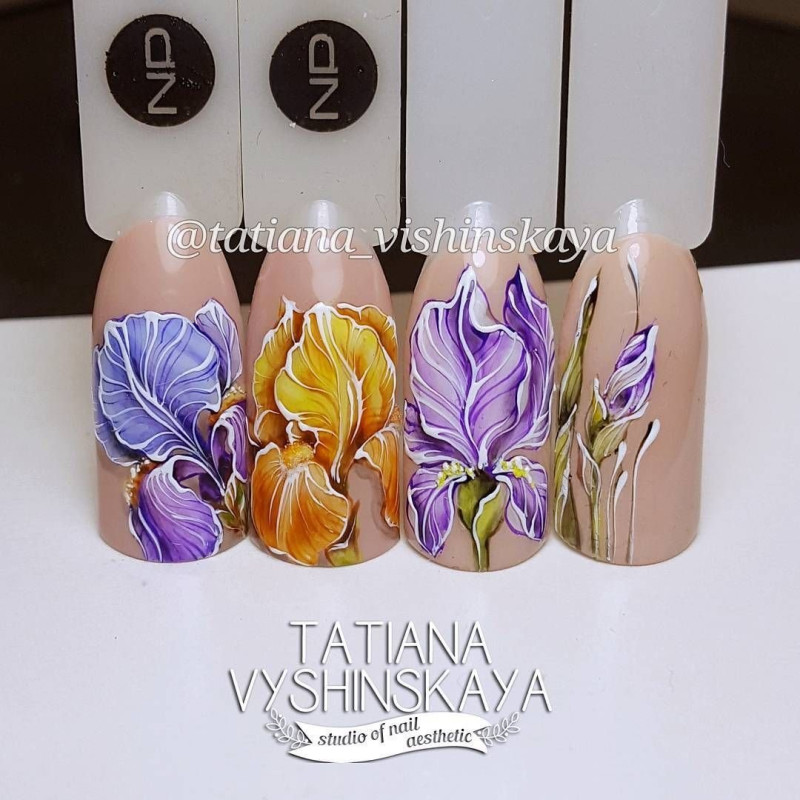 Декоративный ирис может быть любого цвета – чем и нужно воспользоваться, рисуя его на ногтях. Однако нарисовать его сложнее василька, так как листья имеют сложную гофрированную структуру.
