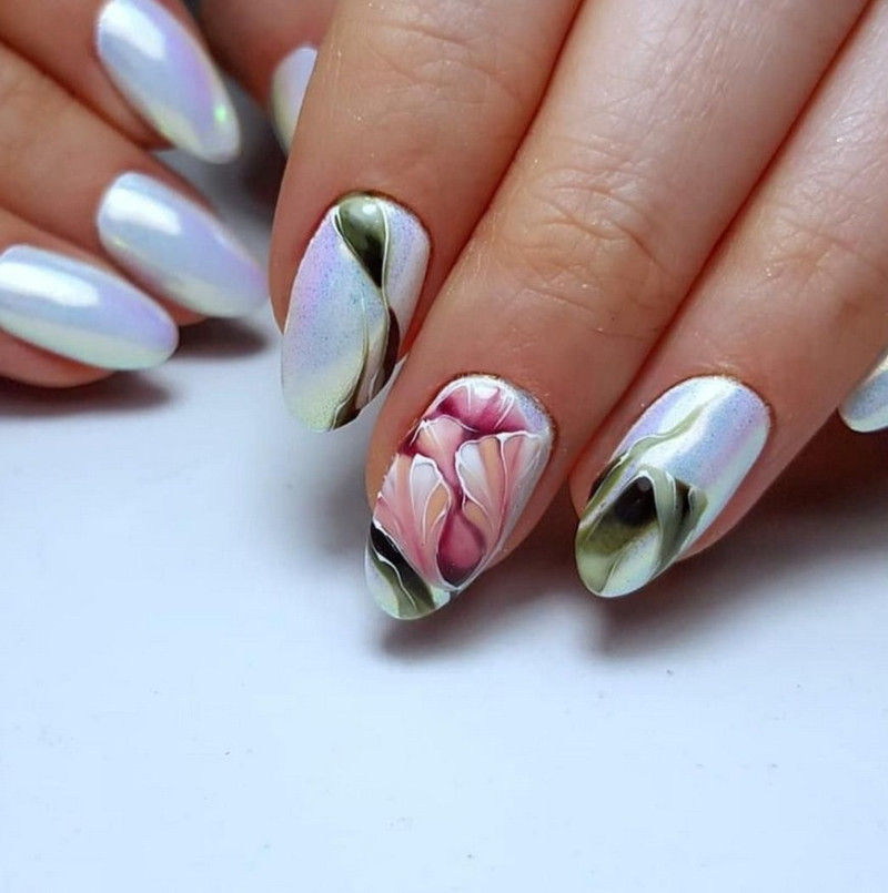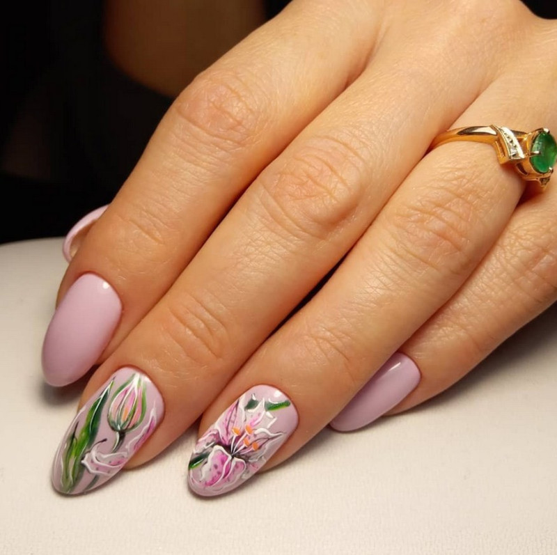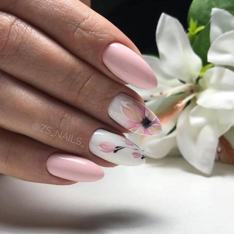 Ногти в форме миндаля позволяют создать нежный и романтичный образ, особенно с помощью мягкой пастельной палитры гель-лака. Нейл-арт выполняется как на короткие, так и на длинные ногти.