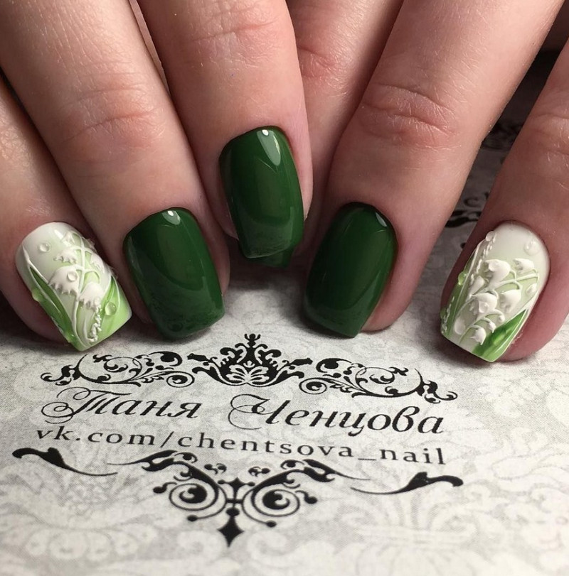 Матовый маникюр лишен блеска, но это совершенно не значит, что он не красивый. Наоборот в этом и кроется его большая сила. Весной особенно модным станет использовать темно-зеленные оттенки матового маникюра, который отлично подходит на короткие ногти. Цвет ваших ноготков может иметь такие оттенки, как болотный, хаки, темно-зеленый, темный изумруд, цвет битого стекла.