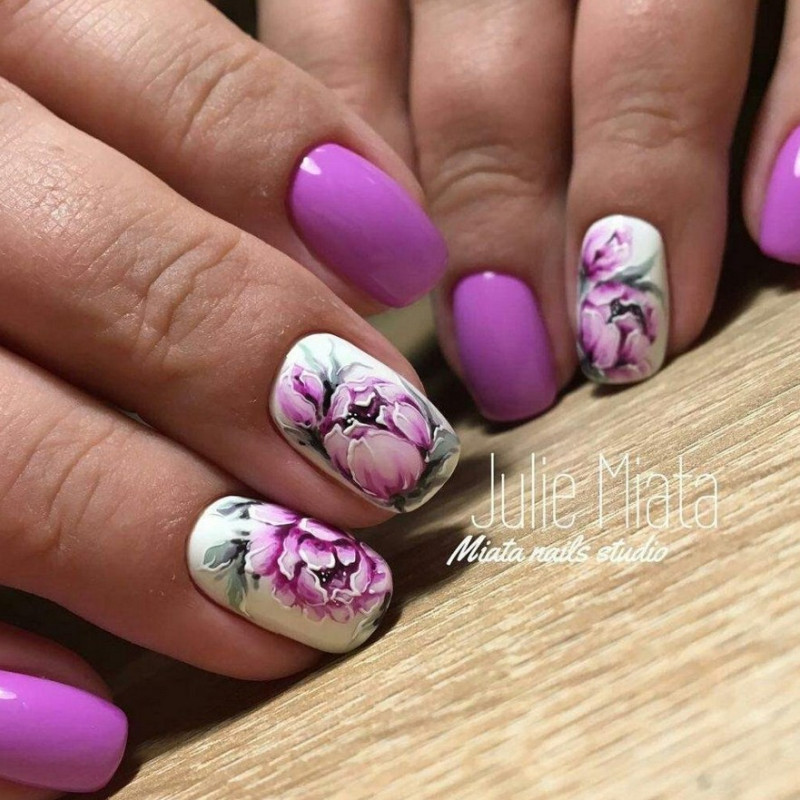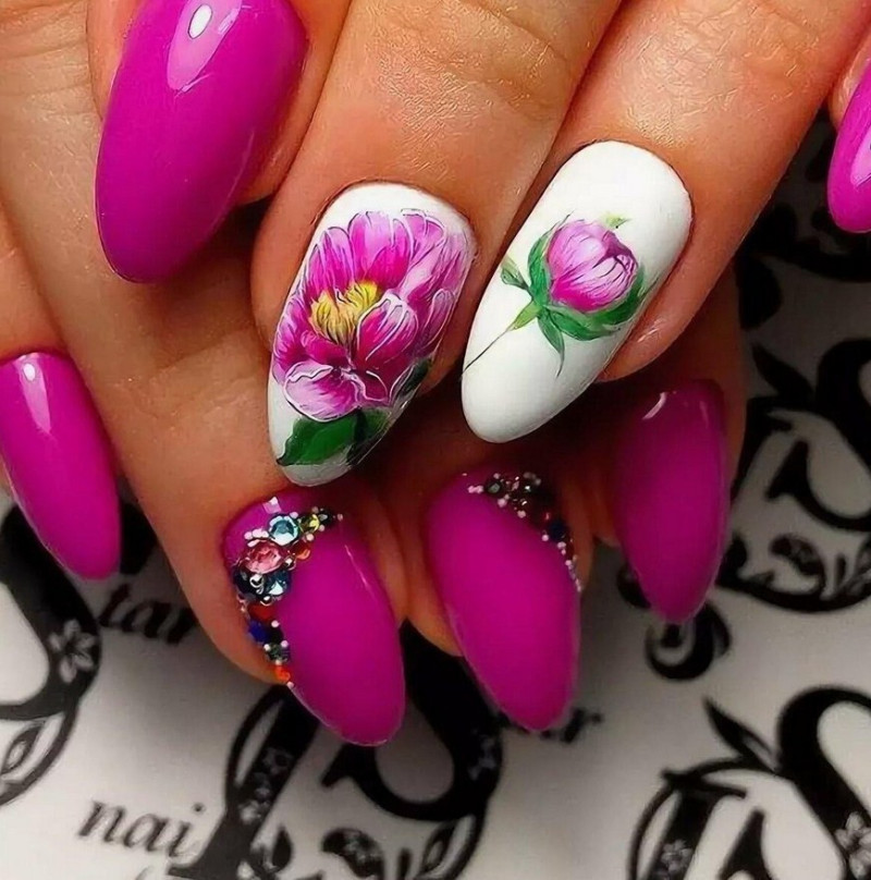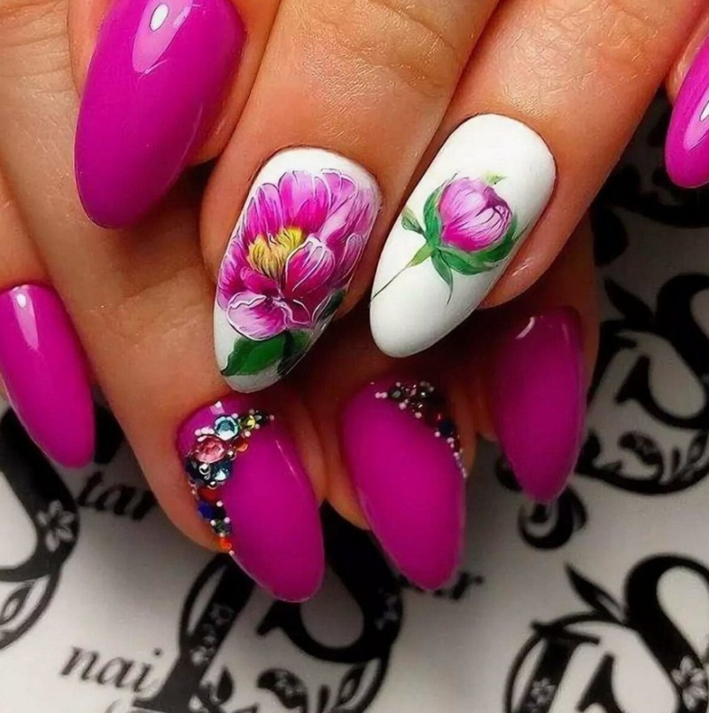 Не уступающий по сложности ирису рисунок с пионами. Его «восковые», похожие на розу, лепестки и сам бутон могут быть переданы только хорошим рисовальщиком и использованием тёмно-розового гель-лака в его размывке с прозрачным.