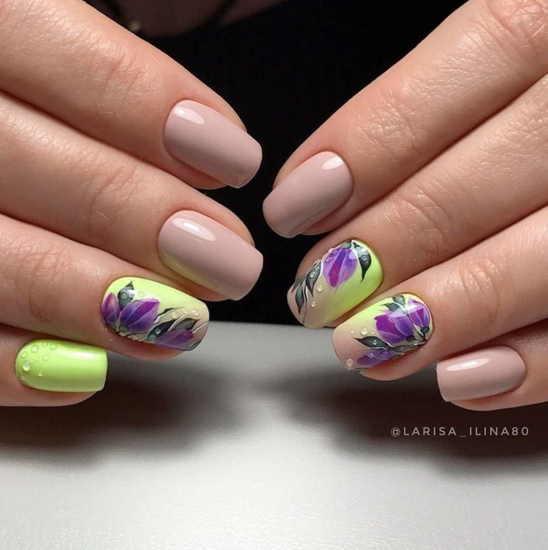 Актуальна роспись ноготков на нейтральном светло-бежевом, голубом, салатовом, нежно-желтом фоне.