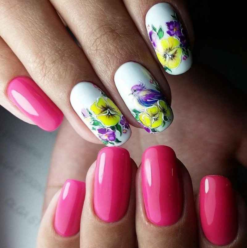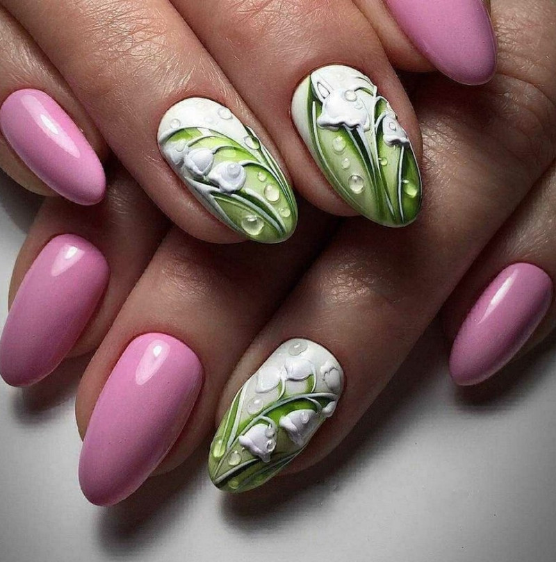 - «Розовые мечты». Палитра розового возглавила хит-парад весенних оттенков. Тона, от насыщенного яркого до практически выбеленного бледно-розового, чаще всего появляются на фото глянцевых журналов, представляющих новинки в мире нейла;