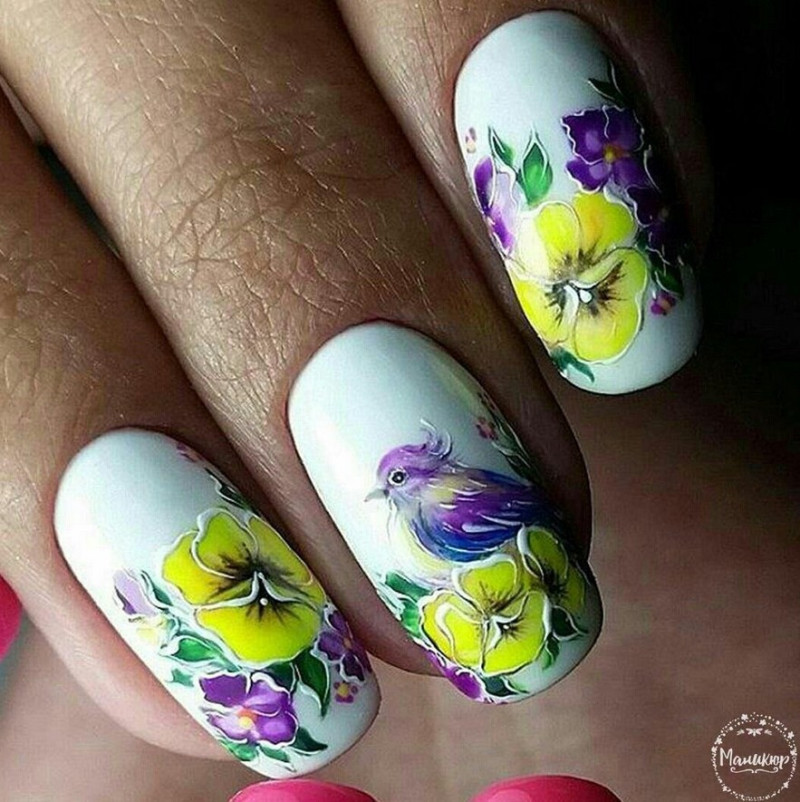 В весеннем дизайне, в отличие от всех других, можно наблюдать цветы и листочки, веточки, птиц. Они выполняются в различных техниках:
