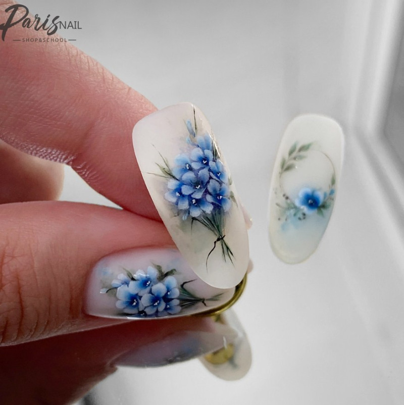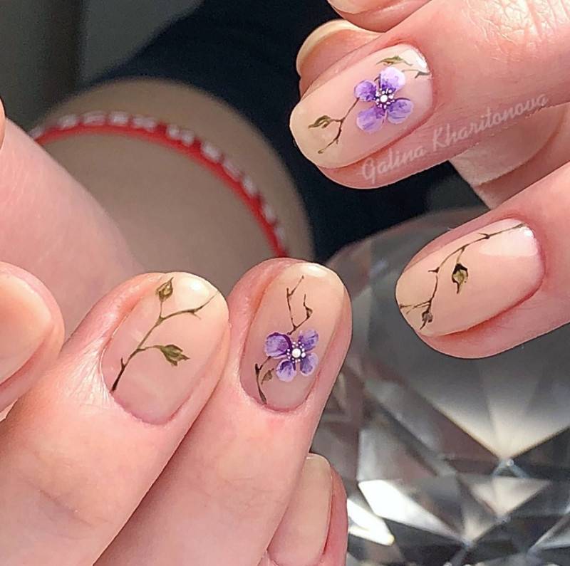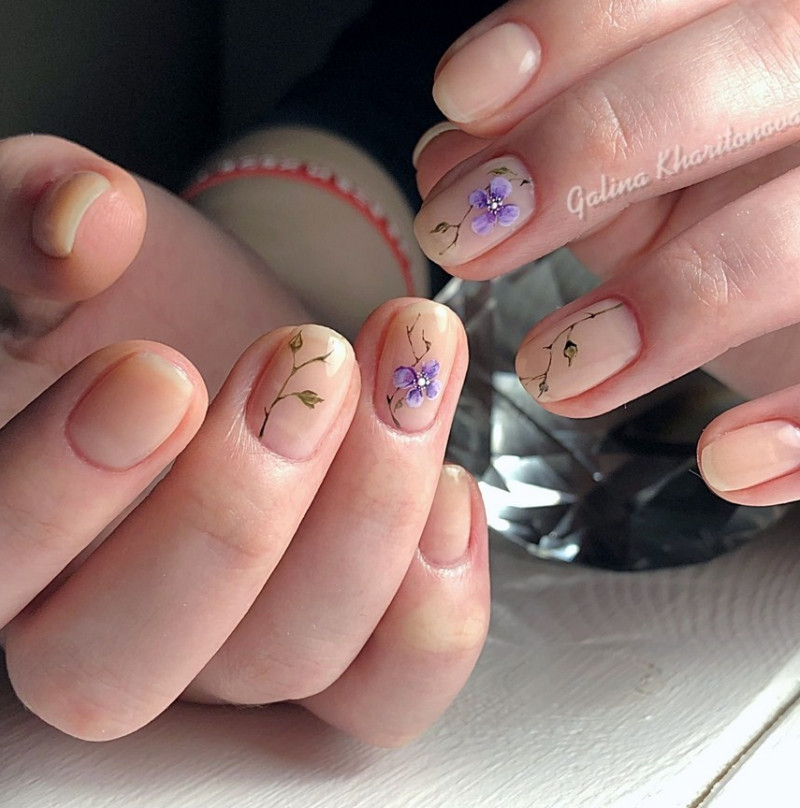 В силу миниатюрности цветка незабудки цветок незабудки впишется в пространство ногтевой пластины, и он там окажется даже не один. Кроме того, у незабудки очень мелкие также и листики, так что и они тоже дополнят живую цветочную картину.