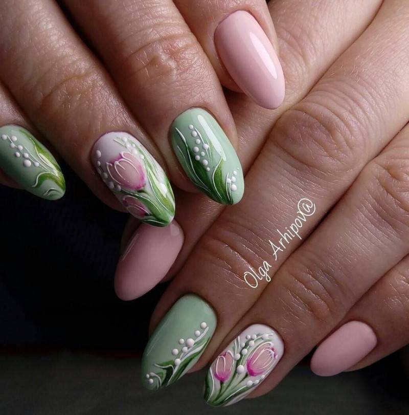 - Салатовый и другие светлые оттенки зеленого. Для дизайна ногтей лучше не брать, как базовый цвет, а использовать в качестве дополнительного элемента. Красивый дизайн ногтей — это переход оливкового в розовый.