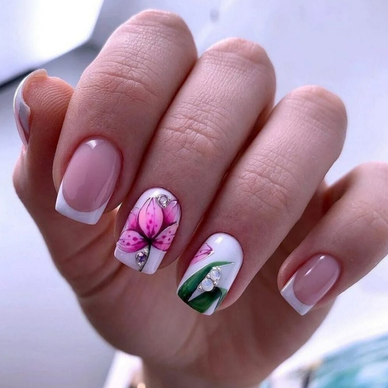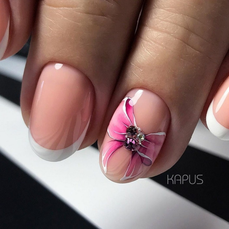 Короткая длина немного ограничивает использование дизайна. Причина в том, что площади пластины может просто не хватить для выкладки задуманного рисунка, например, стразами. Простой совет: сначала выбирайте вариант дизайна, а потом постарайтесь адаптировать его под длину пластины. Например, просто уменьшайте рисунок, чтобы он не занимал всю площадь ногтя. И еще один момент — короткие ноготки лучше не перегружать. В этом случае в весеннем маникюре лучше сделать акцент на один или два ноготка. Этого будет достаточно.