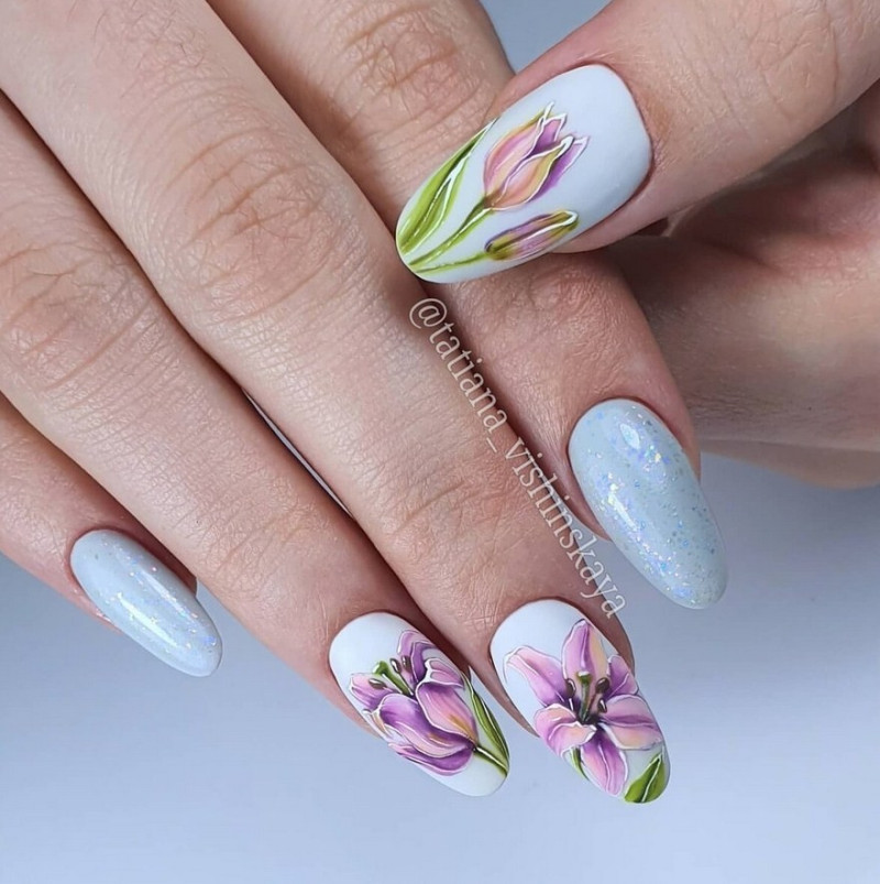 Для длинных ноготков мастера нейл арта весной рекомендуют мраморный дизайн, эффект кошачьего глаза, битое стекло и, конечно, рисунки — цветы, насекомые, птички, небо и др.