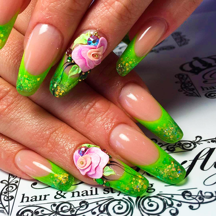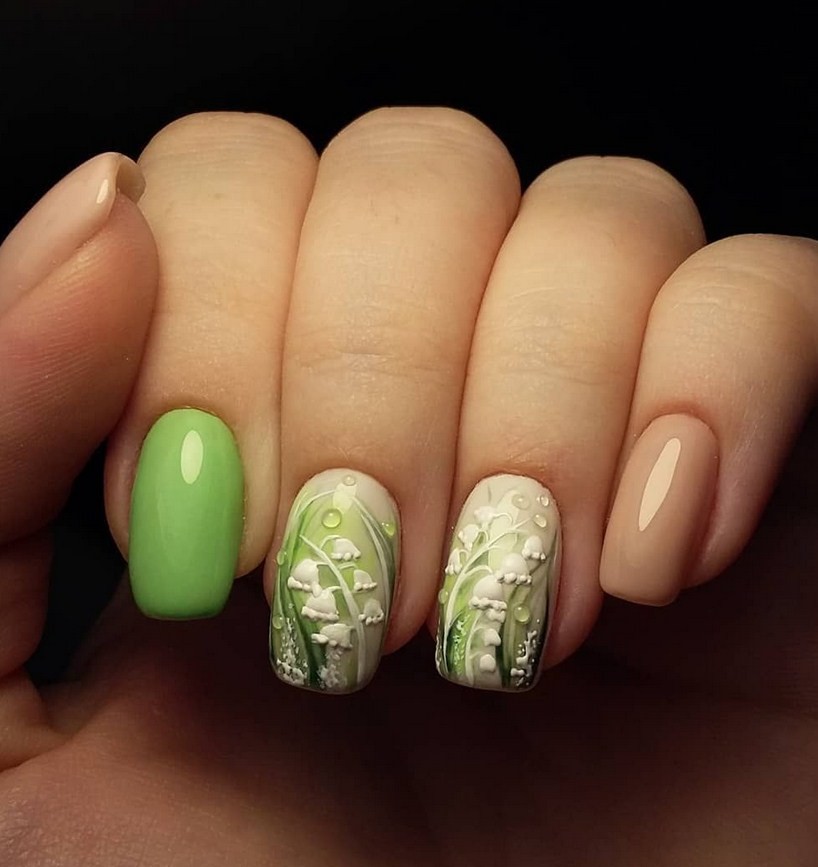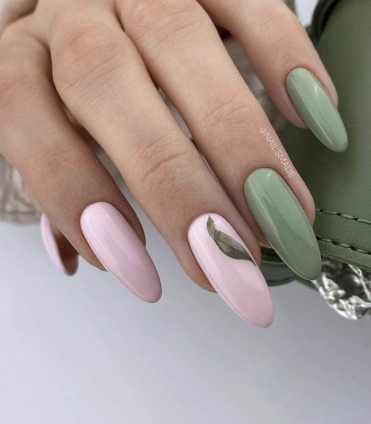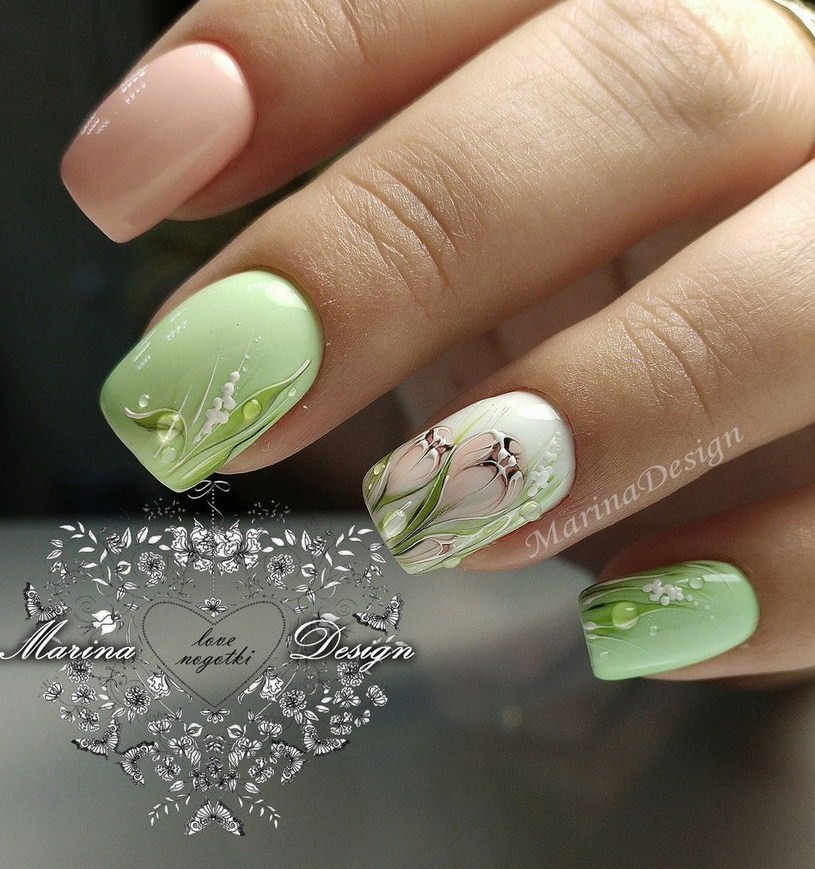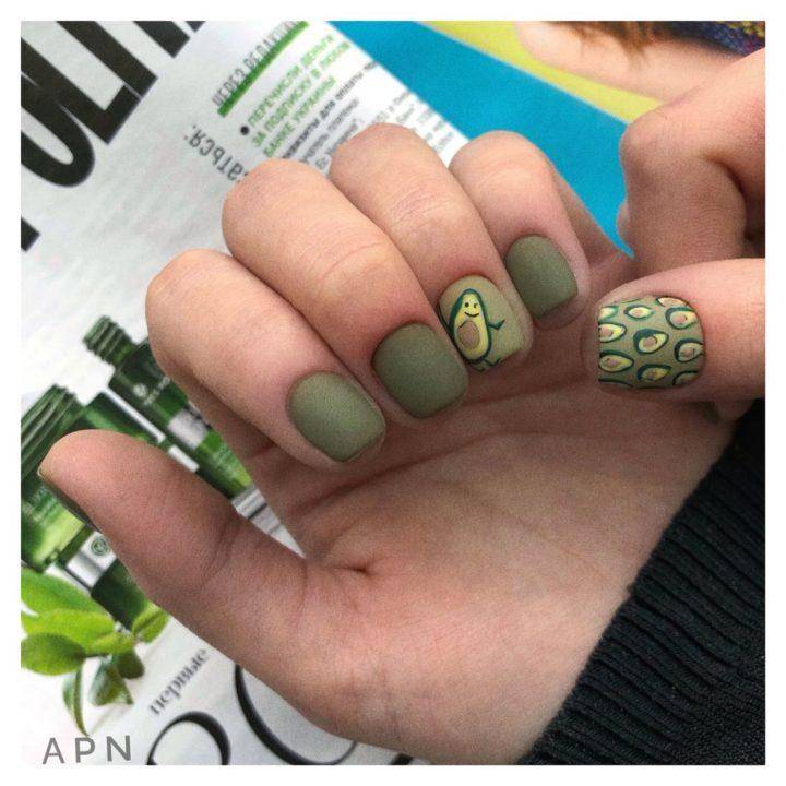 - Салатовый и другие светлые оттенки зеленого. Для дизайна ногтей лучше не брать, как базовый цвет, а использовать в качестве дополнительного элемента. Красивый дизайн ногтей — это переход оливкового в розовый.