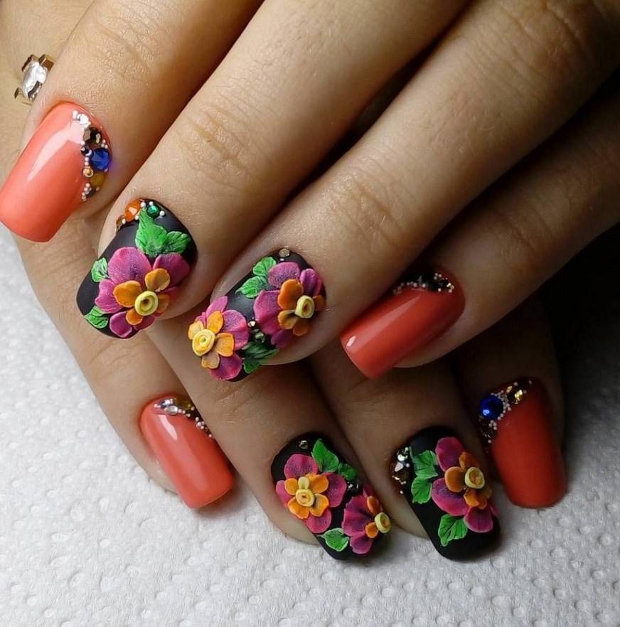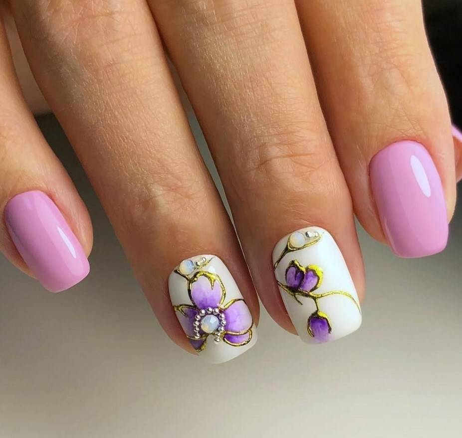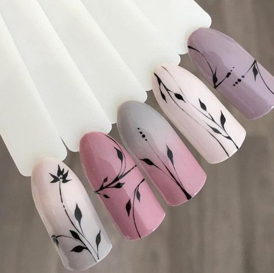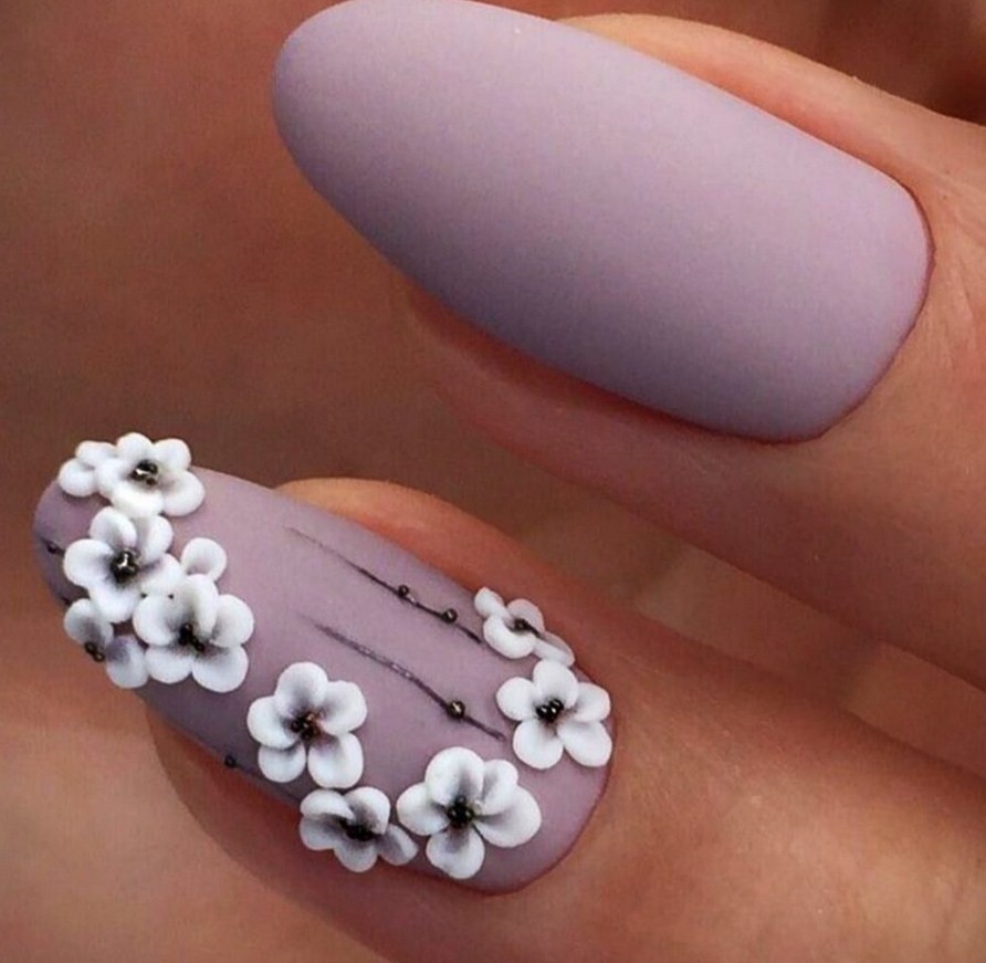 - «Цветочные мотивы». В тренде изображение стеблей тонкими кисточками с еще не распустившимися бутонами роз, веточек сакуры или коробочек хлопка. Рисунки могут наносится лаками, красками или лепниной. Дополнительный декор бусинами и цветными камешками придадут нейлу роскошный вид;