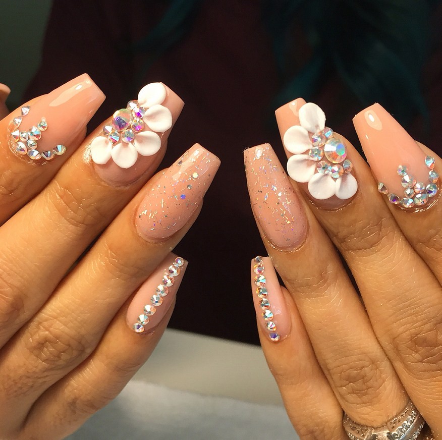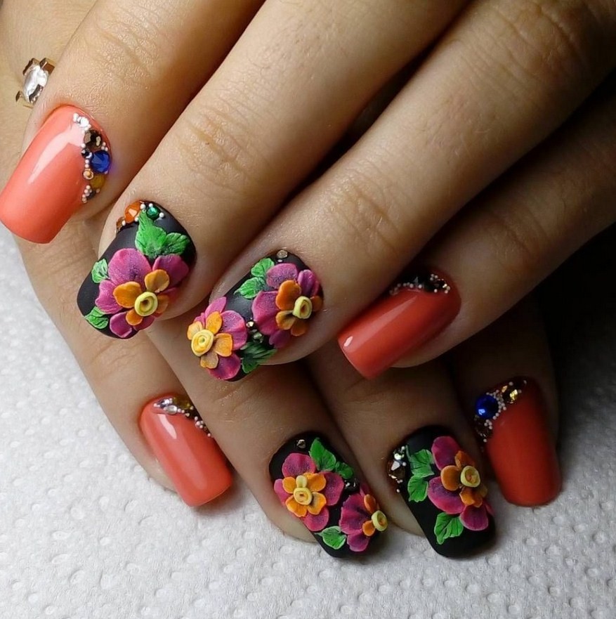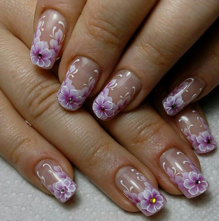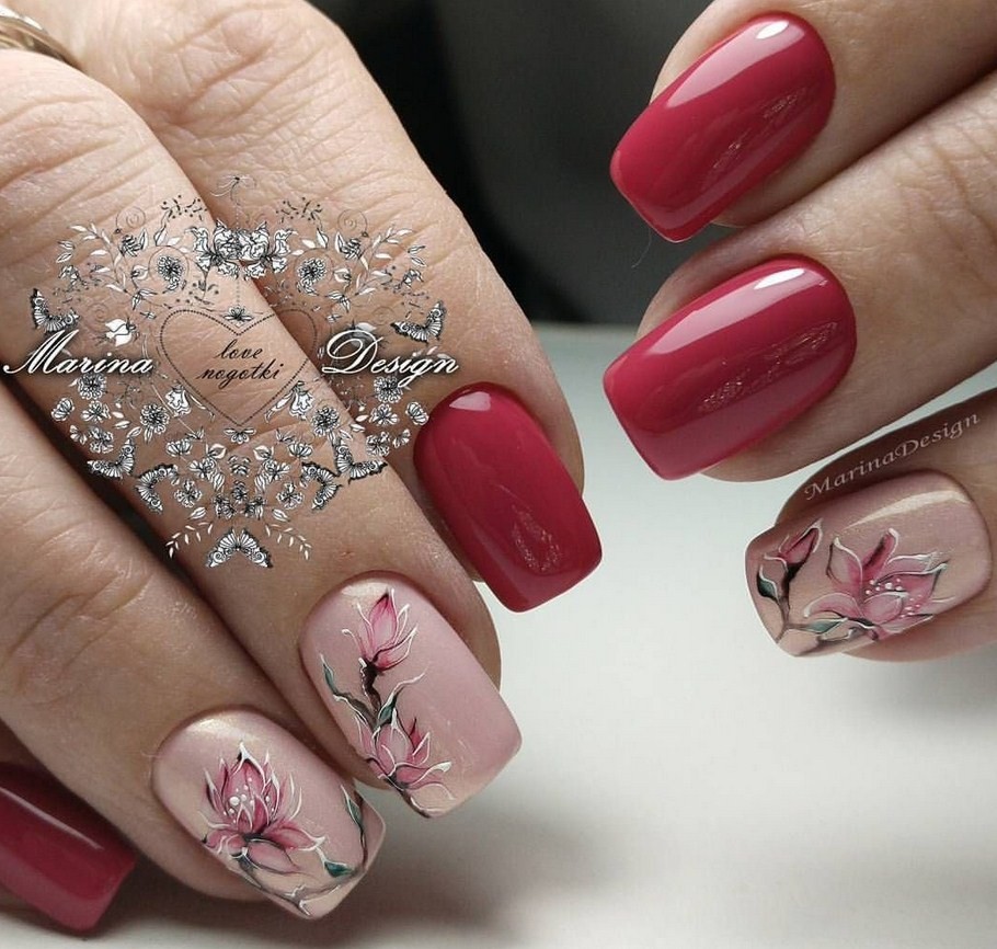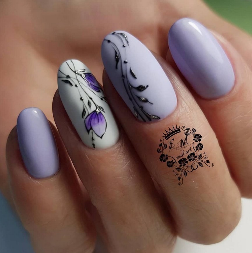 - «Цветочные мотивы». В тренде изображение стеблей тонкими кисточками с еще не распустившимися бутонами роз, веточек сакуры или коробочек хлопка. Рисунки могут наносится лаками, красками или лепниной. Дополнительный декор бусинами и цветными камешками придадут нейлу роскошный вид;