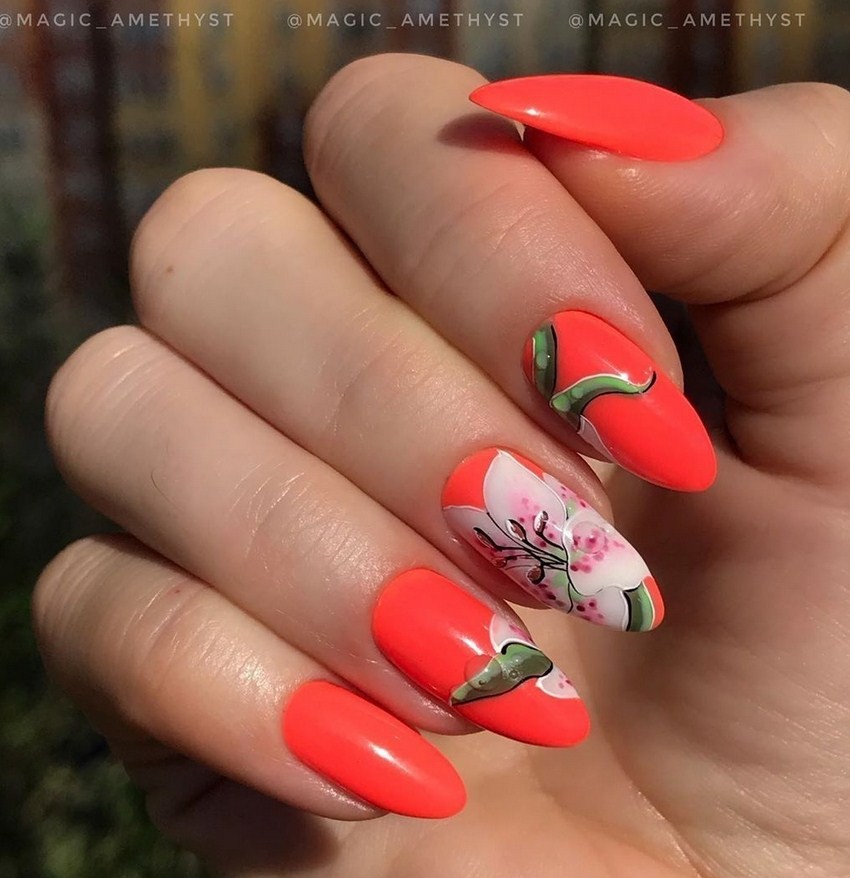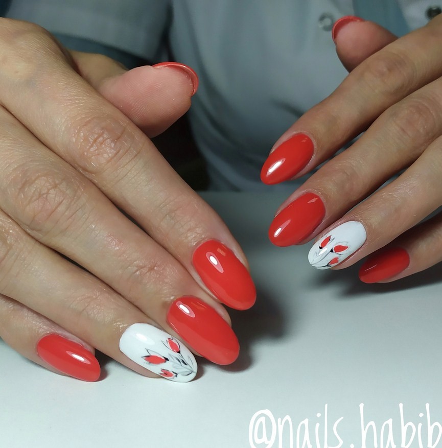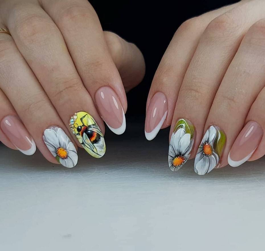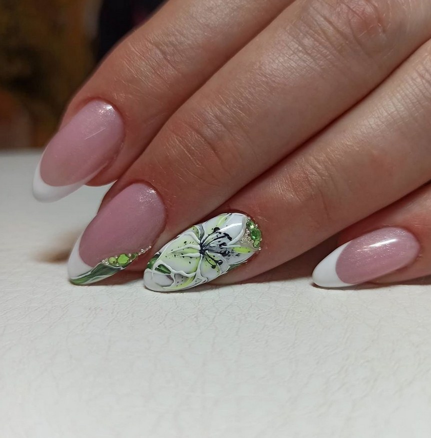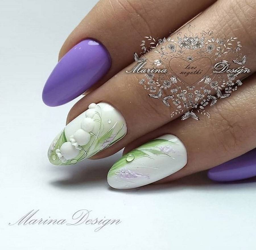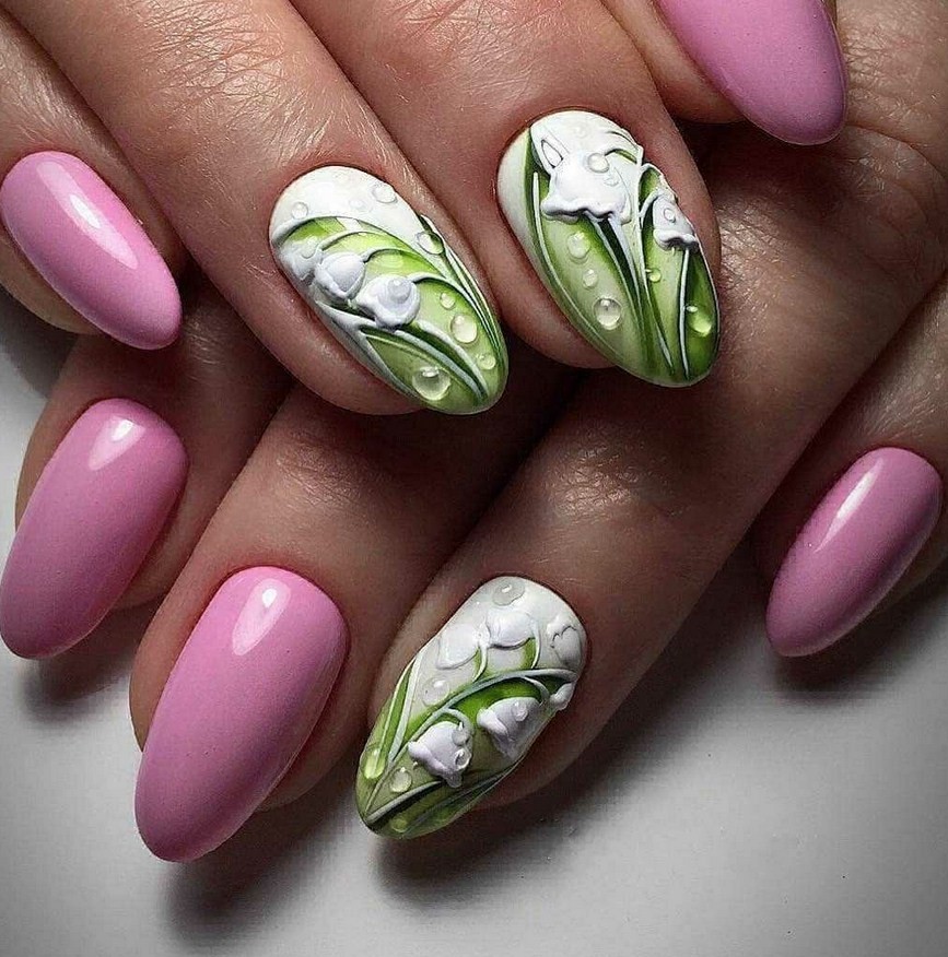 Миндалевидные ноготки, наверное, никогда не выйдут из моды. Это оптимальная и самая универсальная форма. Она отлично сочетается с разными оттенками лака. Весенний маникюр на такую форму может быть очень разным — от яркого необычного френча до втирки с рисунком.