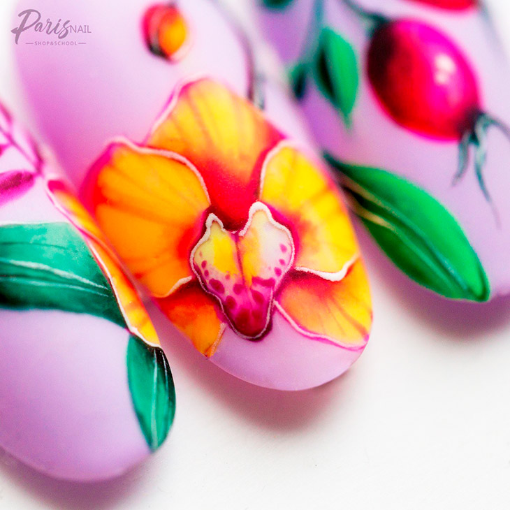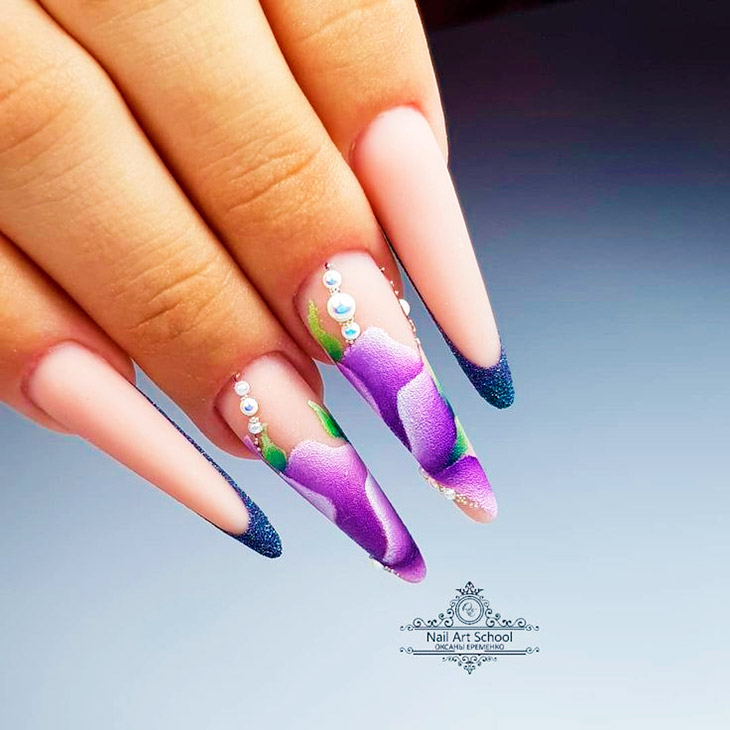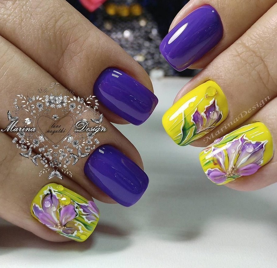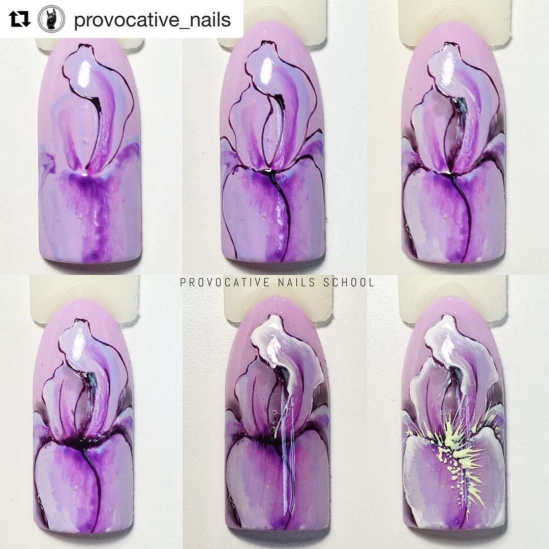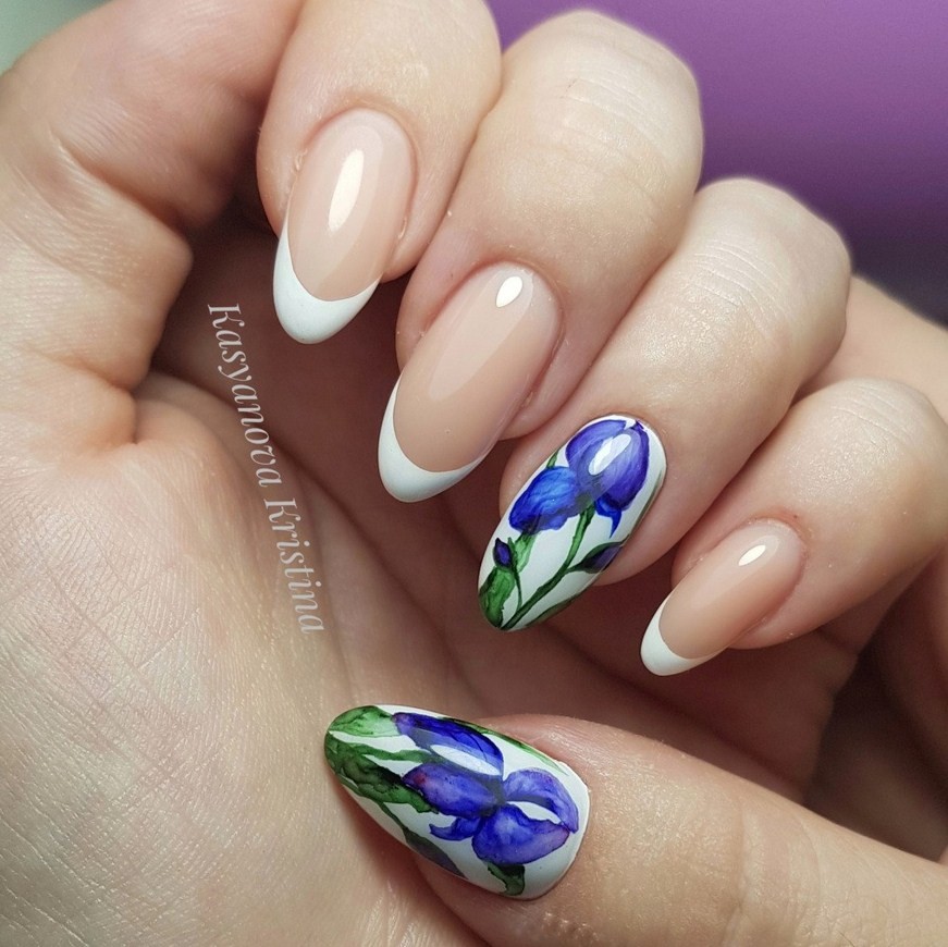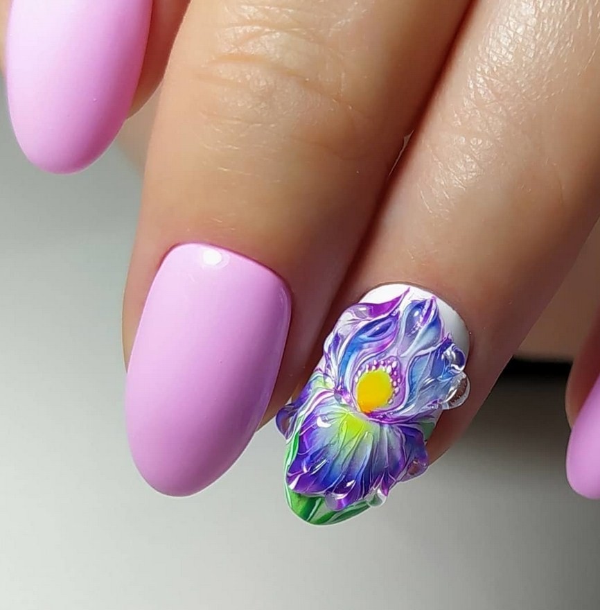 Декоративный ирис может быть любого цвета – чем и нужно воспользоваться, рисуя его на ногтях. Однако нарисовать его сложнее василька, так как листья имеют сложную гофрированную структуру.