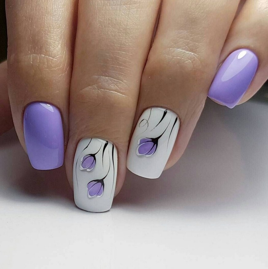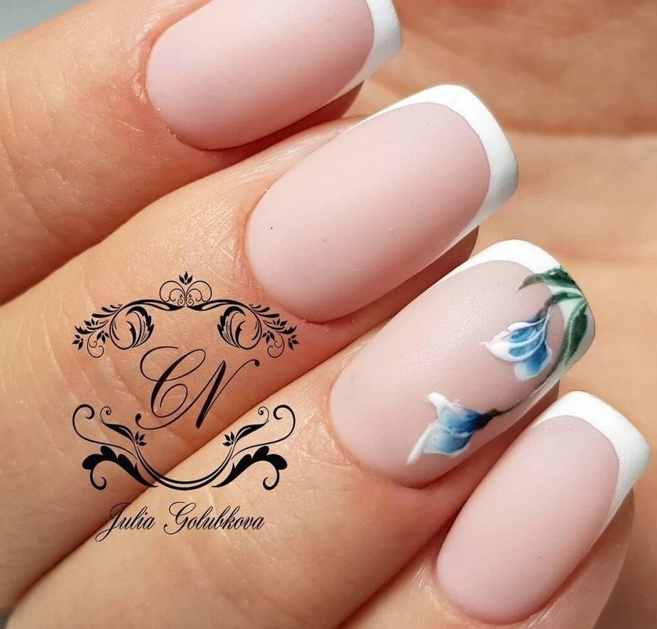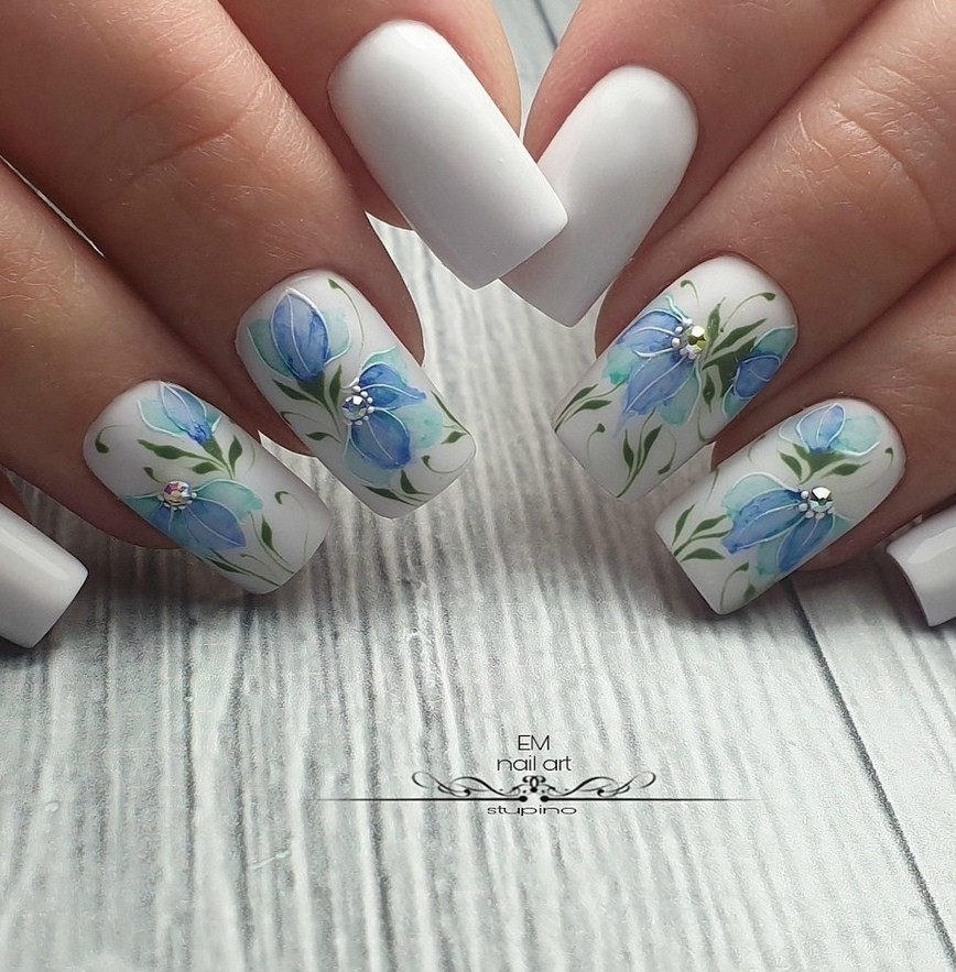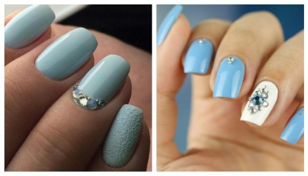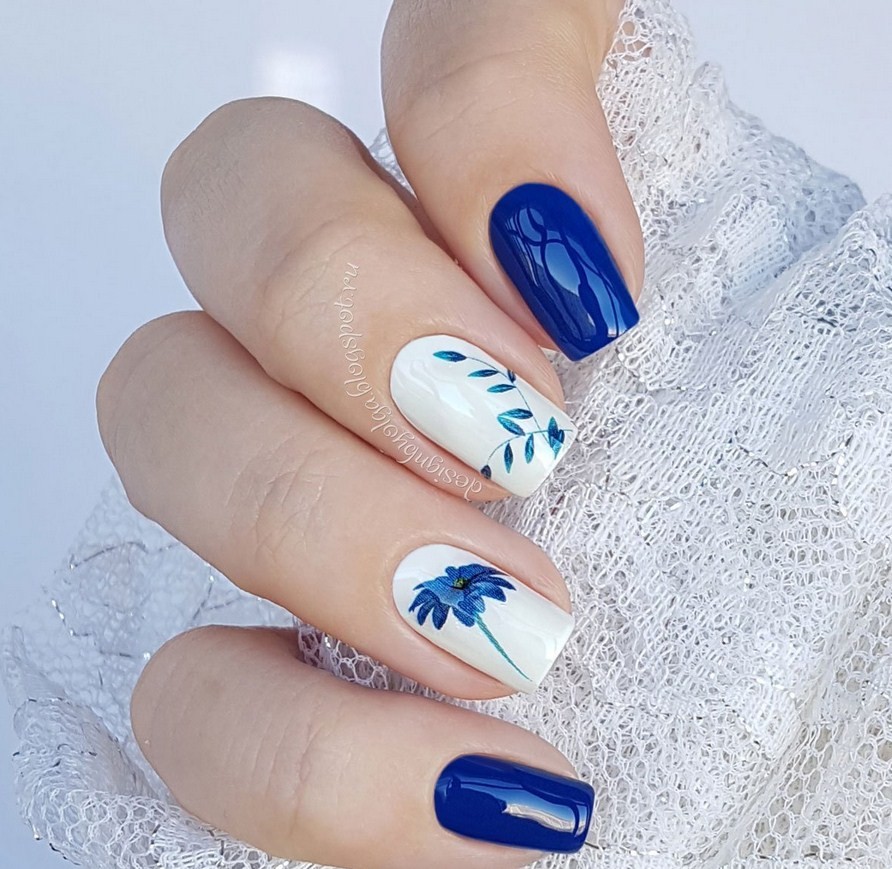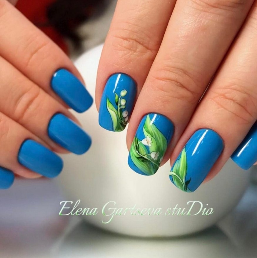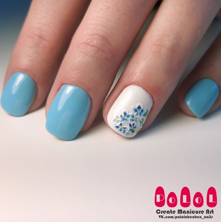 - «Весеннее небо». Голубой и бирюзовый с лазурным подтоном. Сочетание с белым нисколько не укоротит ноготки и придаст им интересный вид. Среди самых популярных нейл-артов — изображение крупных цветов или имитация узора «под гжель» на одном или двух ногтях;
