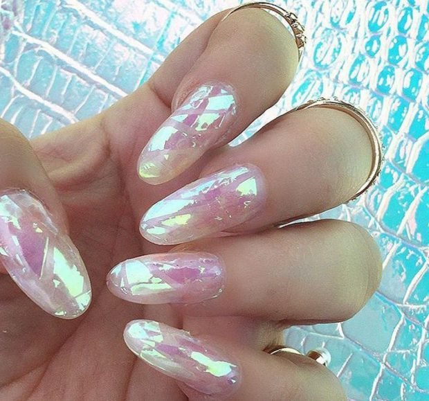 В большинстве случаев сравнительно недавнее творение нейл-дизайнеров выбирается девушками для дискотек и вечеринок. «Битое стекло» отличается неординарным видом из-за эффекта склейки блестящих кусочков. Для создания такой картинки в ход идут фольга, слюда или голографическая пленка, кусочки которых имитируют осколки битого стекла.
