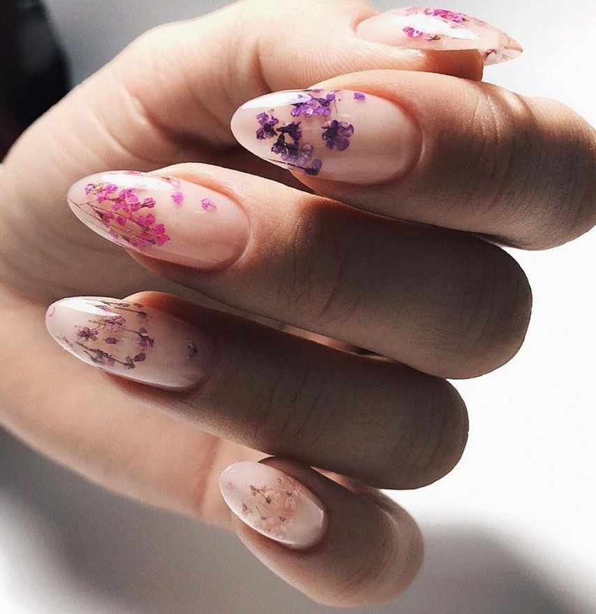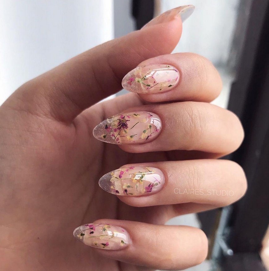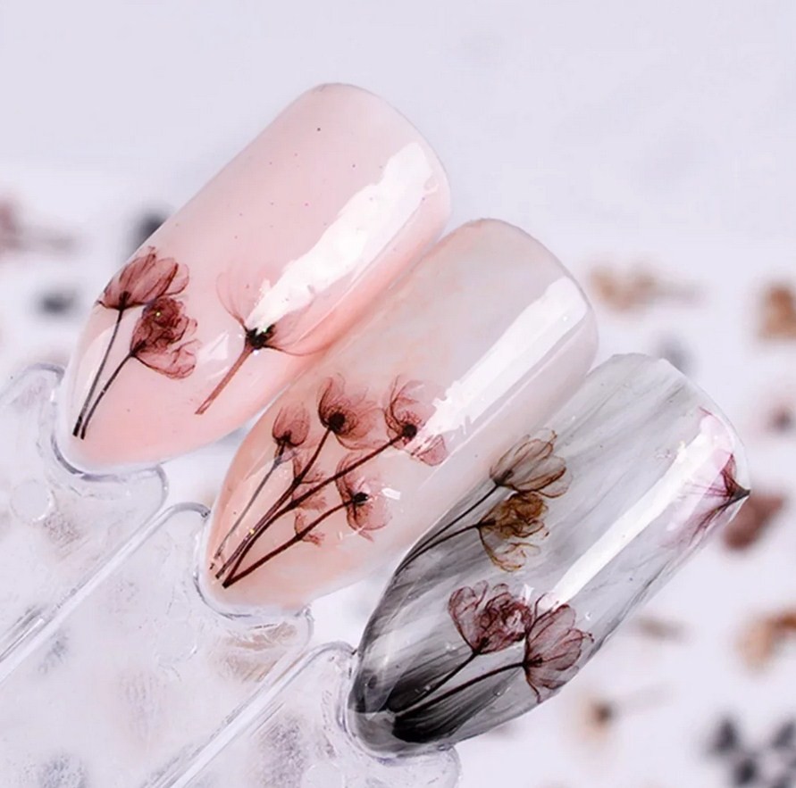 Засушенные фрагменты растений укладываются на покрытую непросохшим слоем базы ногтевую пластину, расправляются и покрываются сверху прозрачны гель-лаком.