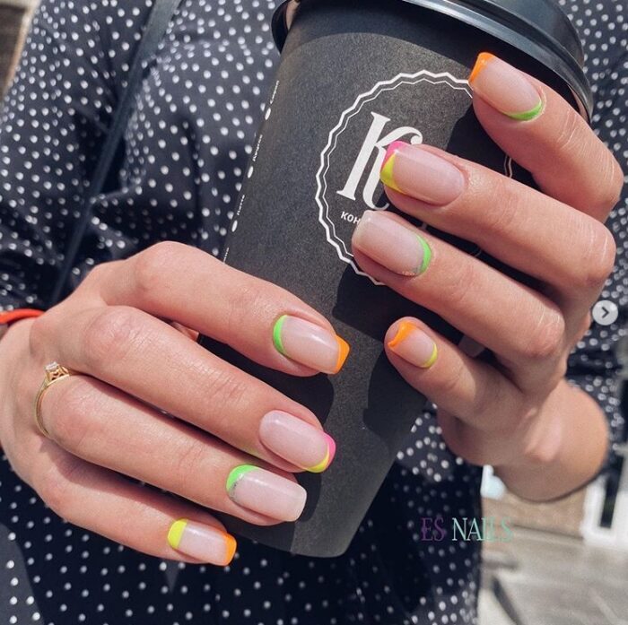 Техника заключается в нанесении прозрачного лака на часть ногтя, тогда как остальное пространство оформляется декором. Утонченный маникюр получается с применением геометрических фигур. Офисный вариант «negative space» – черно-белый. Для повседневных мероприятий можно миксовать сочные цвета гель-лака.
