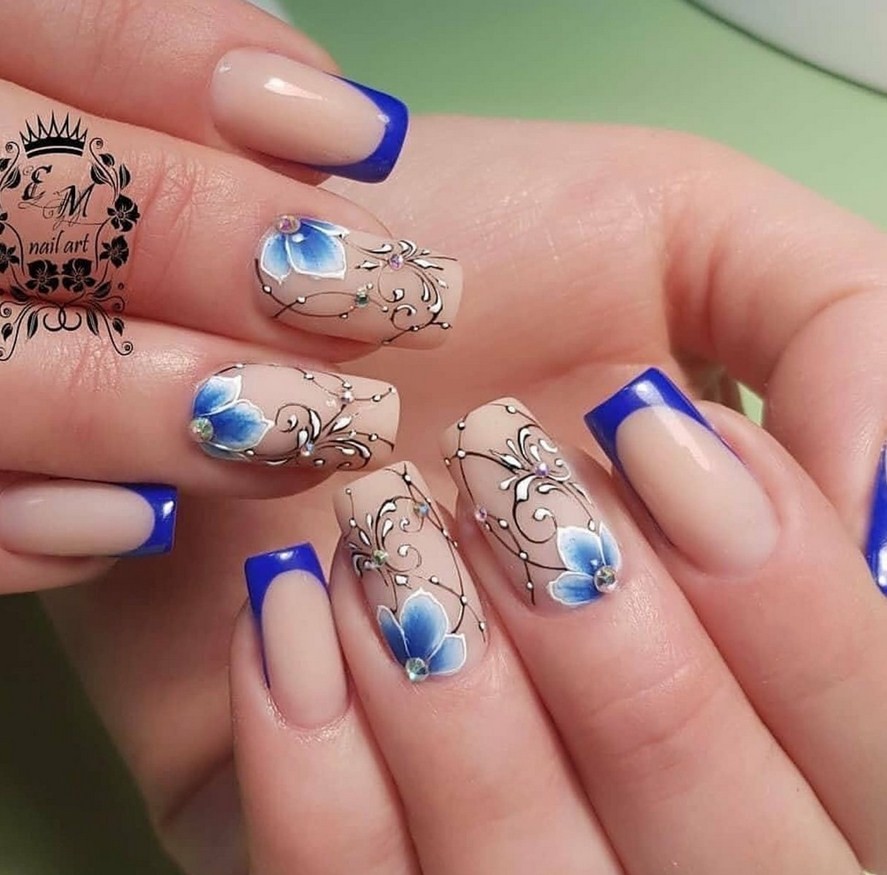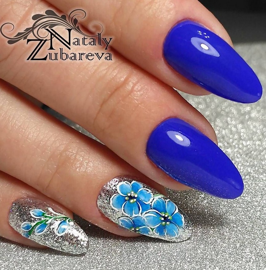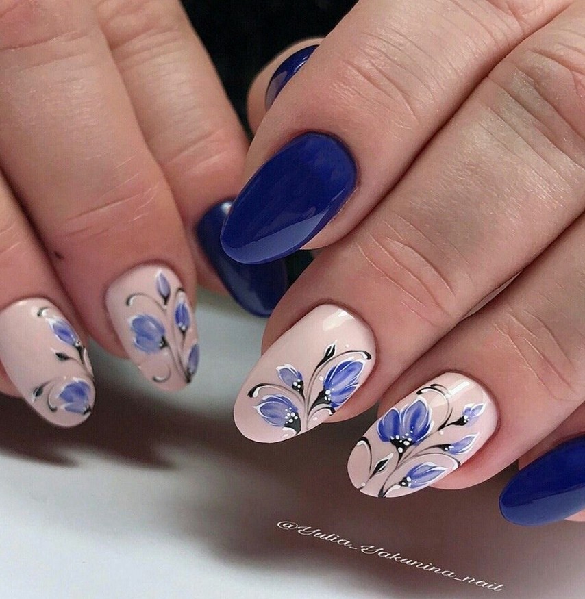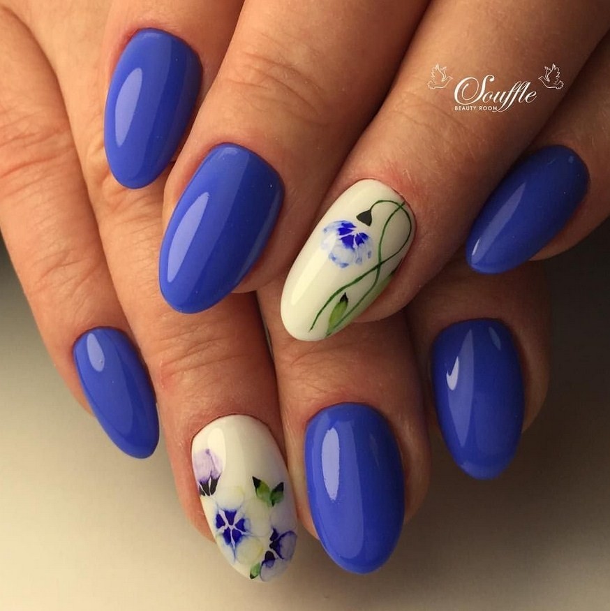 - Глубокий синий. Небо весной становится таким легким, но и при этом насыщенным. Синий — это отличный базовый цвет для маникюра. Также разные оттенки синего могут служить для декора маникюра.