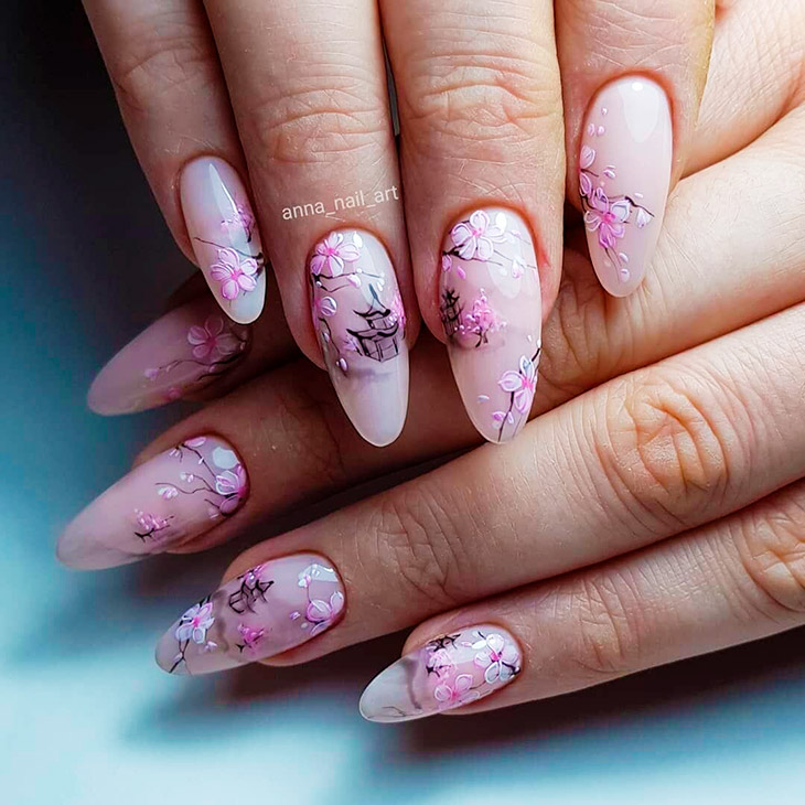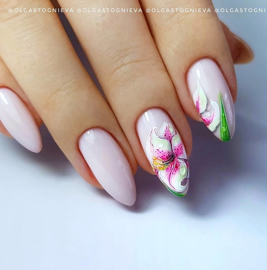Ногти в форме миндаля позволяют создать нежный и романтичный образ, особенно с помощью мягкой пастельной палитры гель-лака. Нейл-арт выполняется как на короткие, так и на длинные ногти.