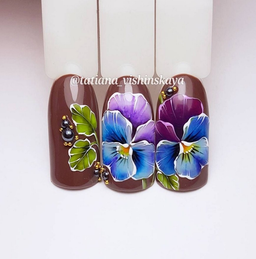 Самые, пожалуй, узнаваемые цветы, живущие на клумбах от Заполярья до субтропиков. Используются только их уменьшенные изображения, так как цветок анютиной глазки о’натюрель слишком крупен, чтобы уместиться на ногтевой пластине.