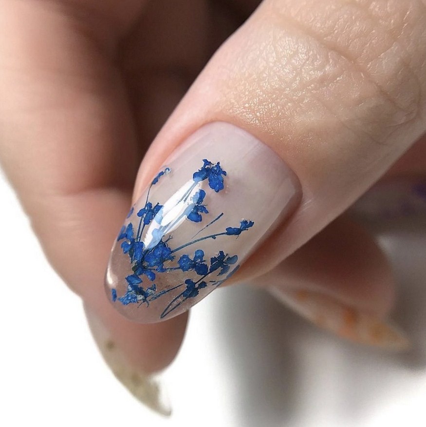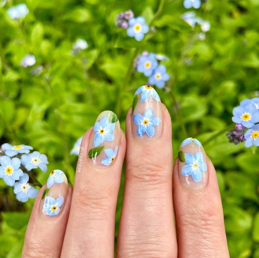 В силу миниатюрности цветка незабудки цветок незабудки впишется в пространство ногтевой пластины, и он там окажется даже не один. Кроме того, у незабудки очень мелкие также и листики, так что и они тоже дополнят живую цветочную картину.