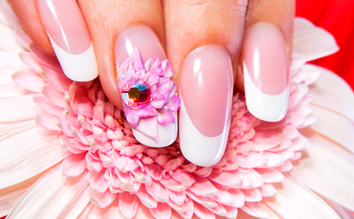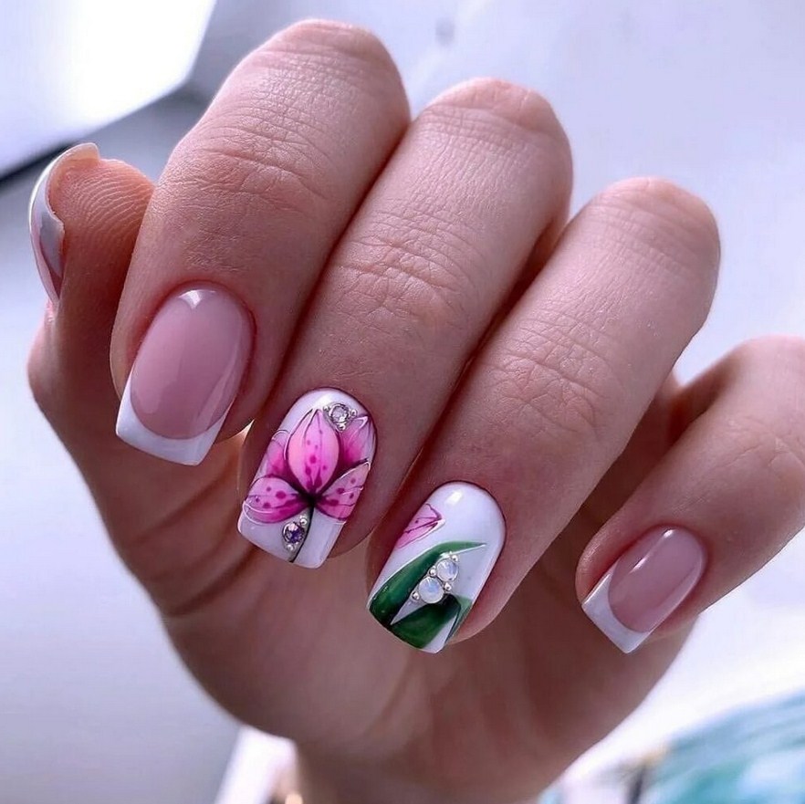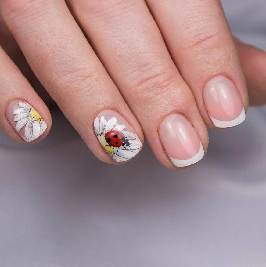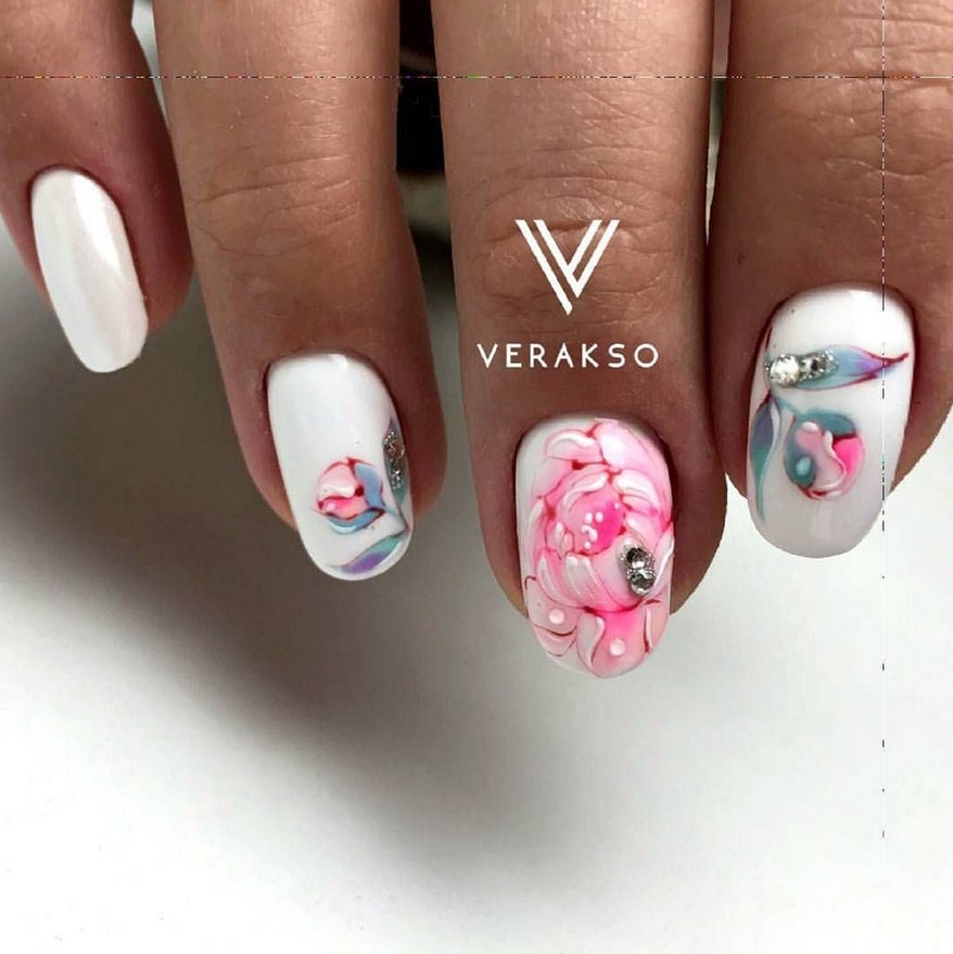 Короткая длина немного ограничивает использование дизайна. Причина в том, что площади пластины может просто не хватить для выкладки задуманного рисунка, например, стразами. Простой совет: сначала выбирайте вариант дизайна, а потом постарайтесь адаптировать его под длину пластины. Например, просто уменьшайте рисунок, чтобы он не занимал всю площадь ногтя. И еще один момент — короткие ноготки лучше не перегружать. В этом случае в весеннем маникюре лучше сделать акцент на один или два ноготка. Этого будет достаточно.