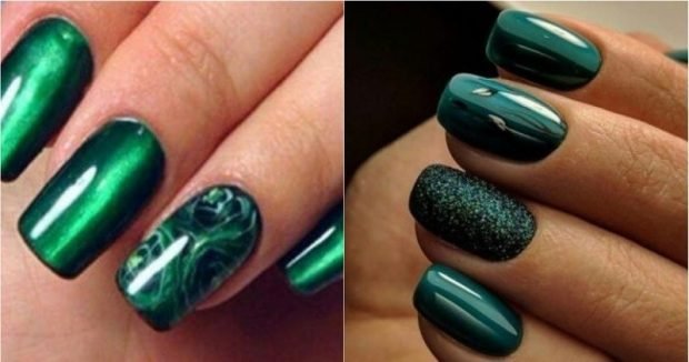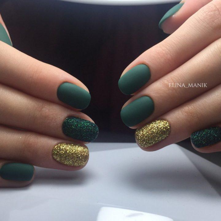 Мастера часто комбинируют матовый зеленый с глянцем, что в итоге формирует довольно-таки неплохой результат. Туже технику можно использовать и для создания френча, где линия улыбки имеет глянцевый темно-зеленый цвет, а ногтевое ложе матовый.