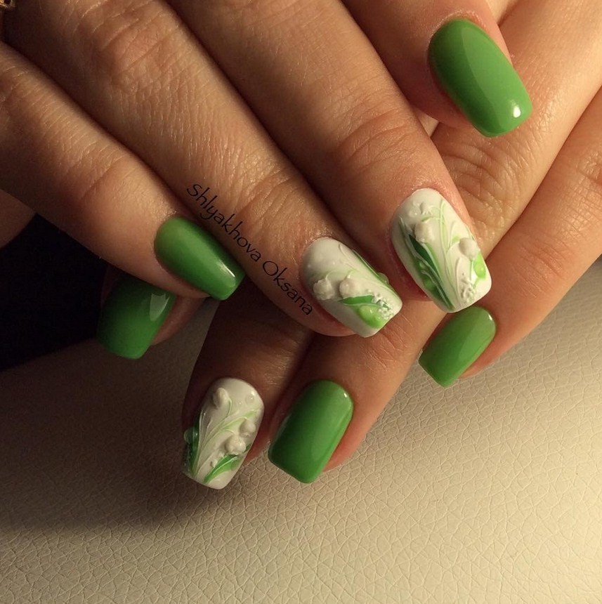 - Свежий зеленый. В это время года появляется новая растительность, оживляется природа. Этот цвет может служит и основой, и дополнением к другому гель лаку.