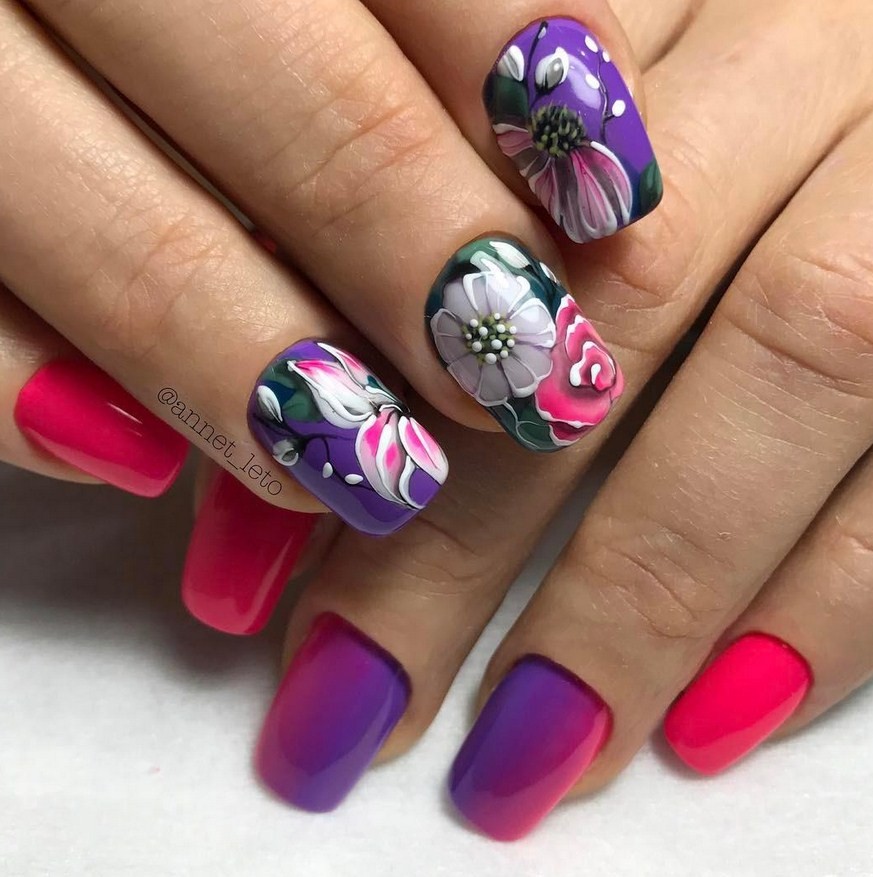 На фото в интернете можно видеть модные тенденции маникюра на весну 2022 года. Омбре не уступает свои позиции, оставаясь не один сезон востребованным видом дизайна. На длинных ногтях омбре смотрится очень стильно. Разнообразие цветов лакового покрытия дает возможность создавать потрясающие сочетания. В этом сезоне популярностью пользуется переход от нежно-розового до лилово-сиреневого.