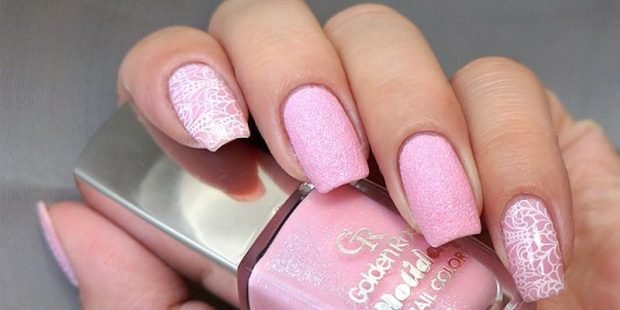 На длинных ногтях прекрасно смотрится узор с кружевом. Романтичный маникюр можно создать с применением минимального количества декорирующих элементов.