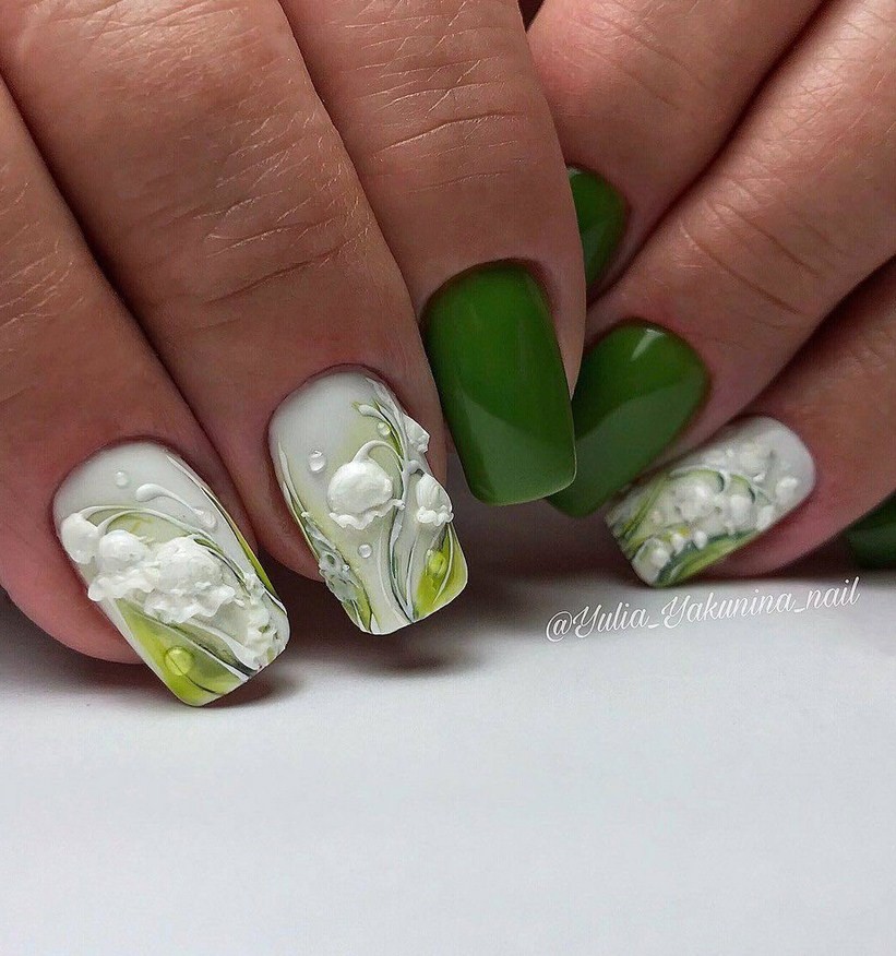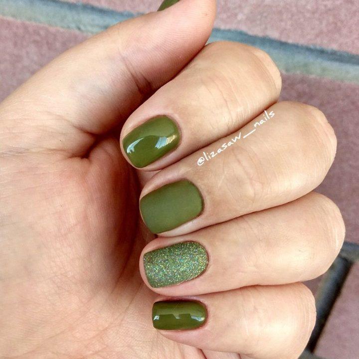 Матовый маникюр лишен блеска, но это совершенно не значит, что он не красивый. Наоборот в этом и кроется его большая сила. Весной особенно модным станет использовать темно-зеленные оттенки матового маникюра, который отлично подходит на короткие ногти. Цвет ваших ноготков может иметь такие оттенки, как болотный, хаки, темно-зеленый, темный изумруд, цвет битого стекла.