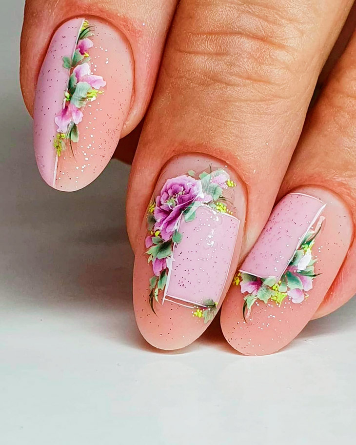 Весной актуальны романтические оттенки маникюра, в которых элементы «разбитого стекла» выполнены из материалов смежных или гармоничных тонов с основным фоном.